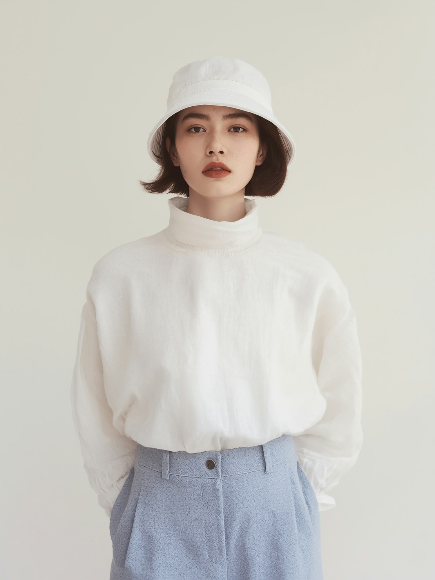 Stylish woman in a white bucket hat, high-neck blouse, and light blue trousers against a minimalistic background.