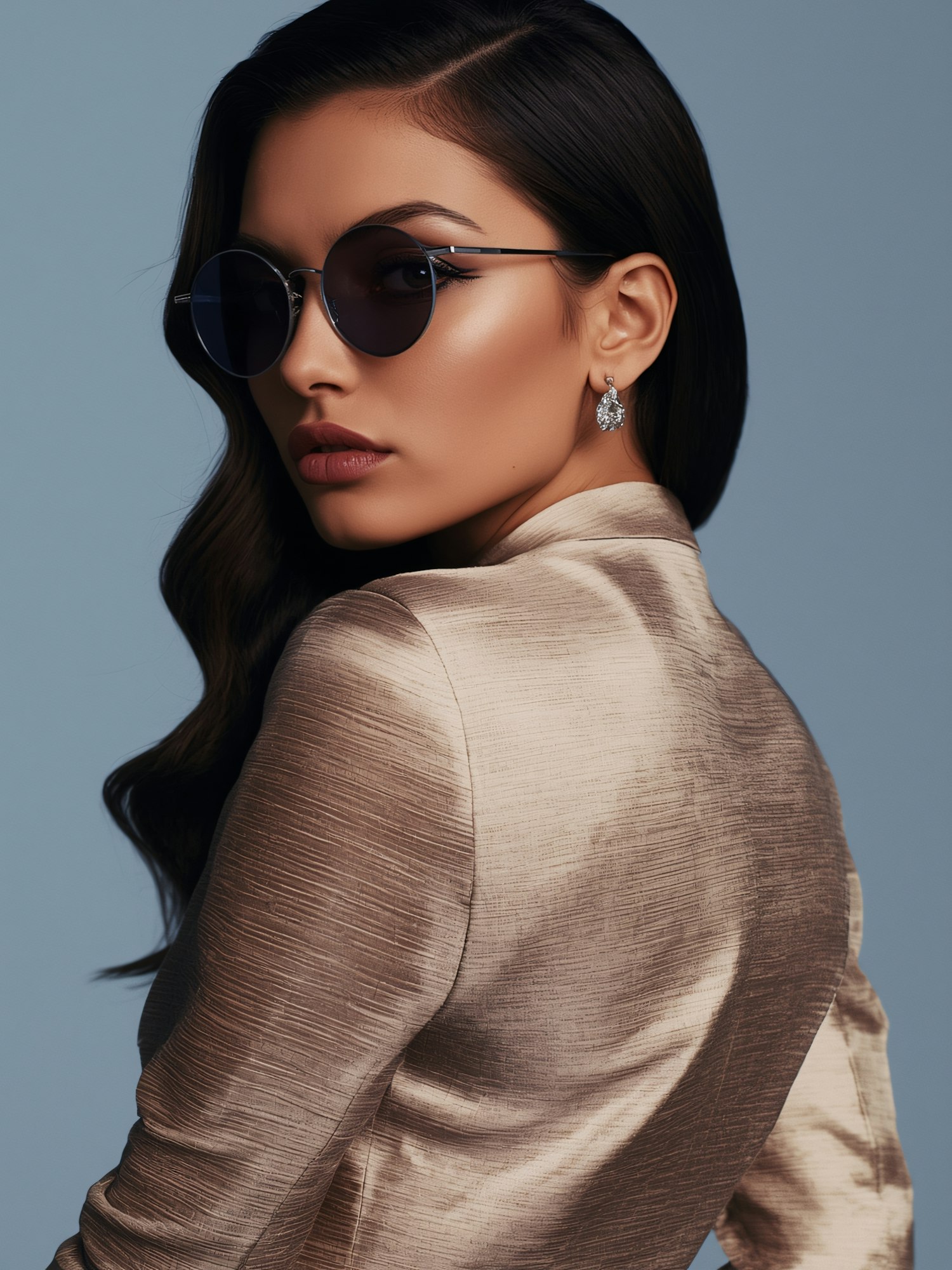 Stylish woman in round sunglasses and a shimmering beige top, with elegant earrings and a confident look against a light blue background.