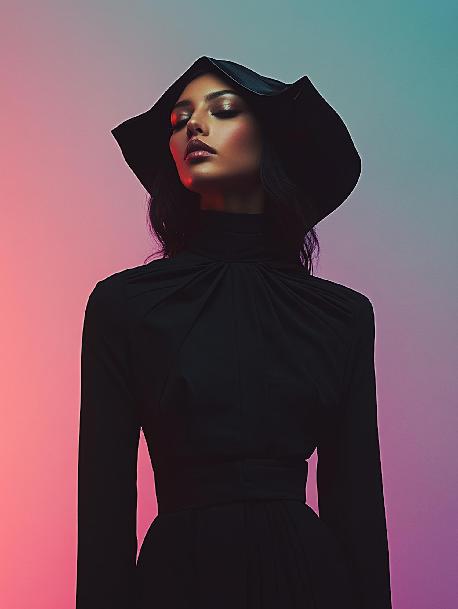 Elegant woman in a black outfit and wide-brimmed hat, set against a pink-to-teal gradient background with dramatic lighting.
