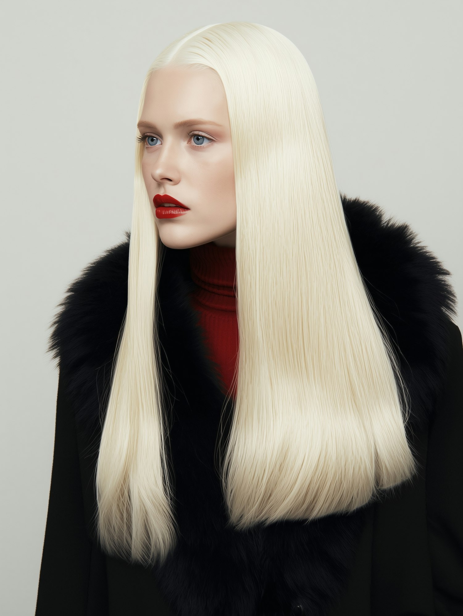 Elegant woman with platinum blonde hair, red lipstick, and a black fur-collared coat, exuding a modern and sophisticated style.