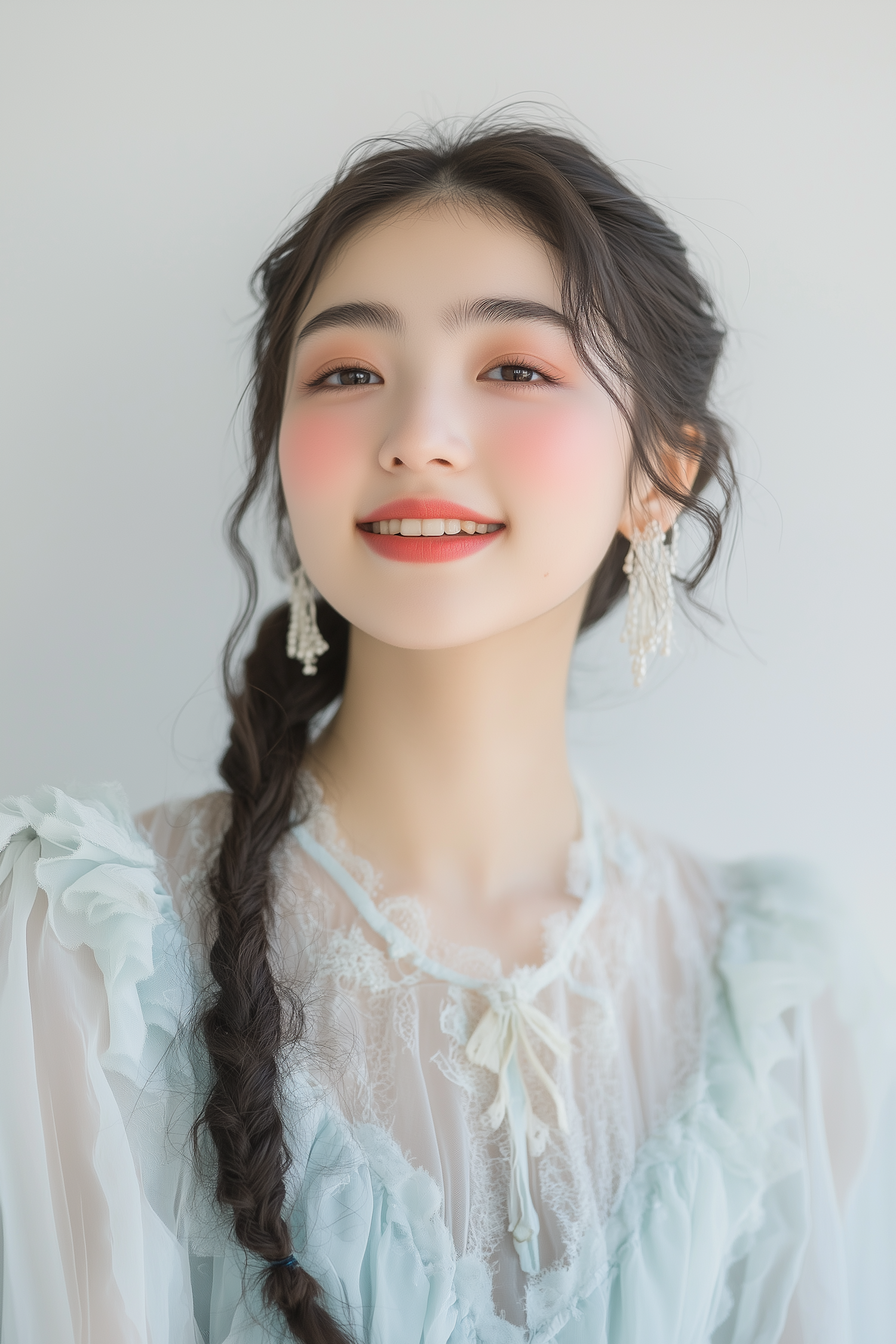 A smiling woman with braided hair, rosy cheeks, and a lace dress, accessorized with pearl earrings, in soft natural lighting.