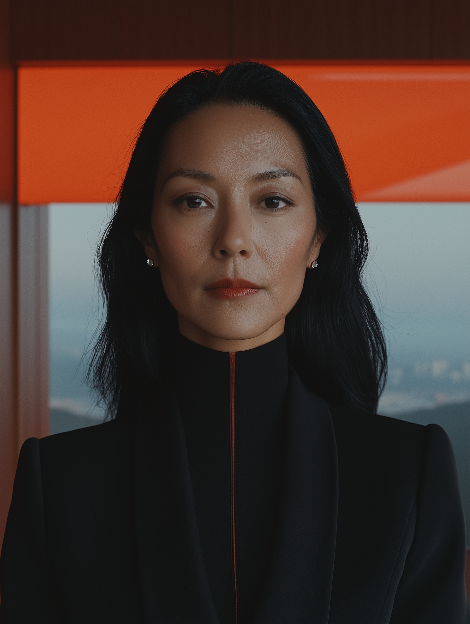 Elegant Asian woman in a sleek black outfit with a bold orange background, exuding confidence and sophistication.