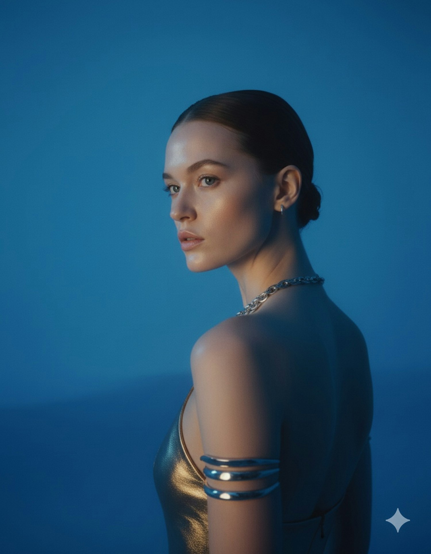 A woman in a gold dress and silver accessories poses against a blue background, her sleek hairstyle and serene expression highlighted.