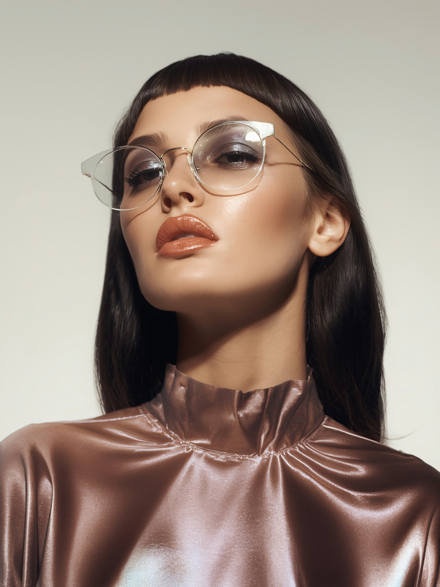 A stylish woman with sleek hair, transparent glasses, and a metallic rose-gold top, showcasing a modern and elegant aesthetic.