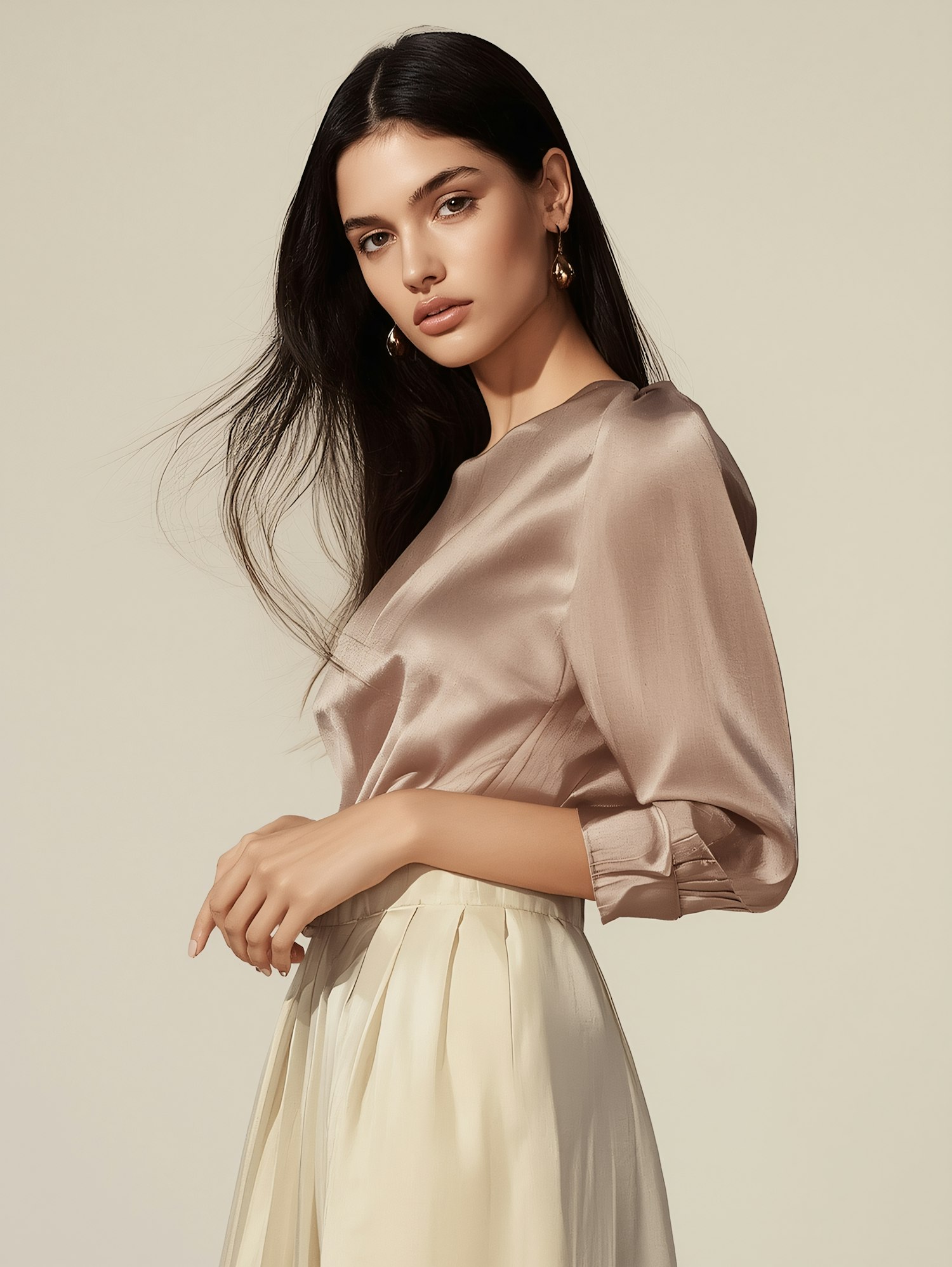 Elegant woman in a silky beige blouse and cream skirt, accessorized with gold earrings, posing against a neutral background.