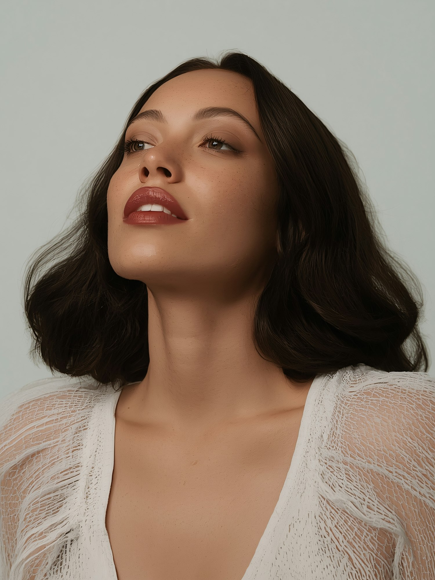 A close-up portrait of a woman with wavy dark brown hair, fair skin, and red lipstick, wearing a white textured top against a neutral background.