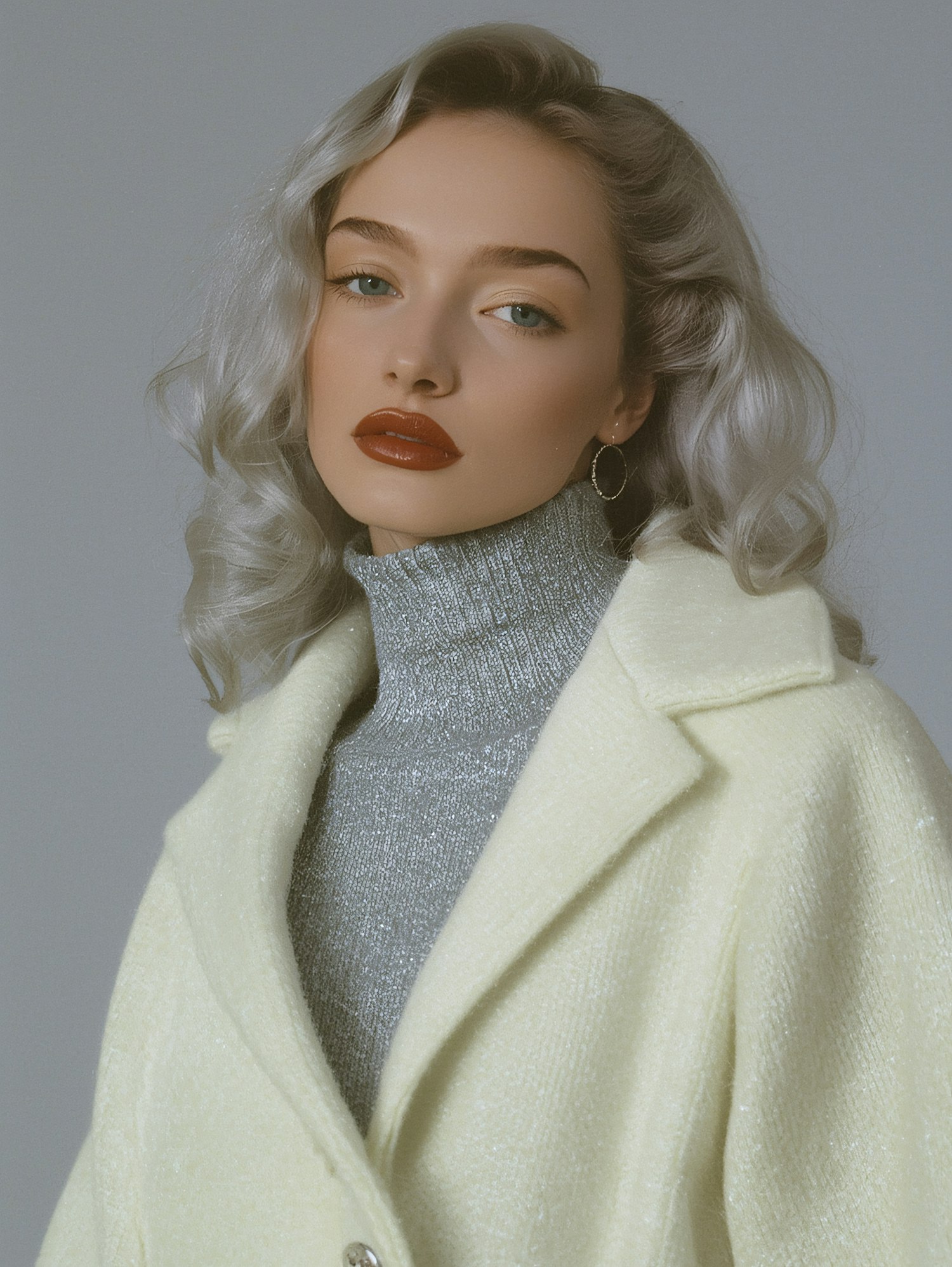 Elegant woman with blonde waves, red lips, and a chic outfit featuring a light coat and silver turtleneck against a neutral backdrop.