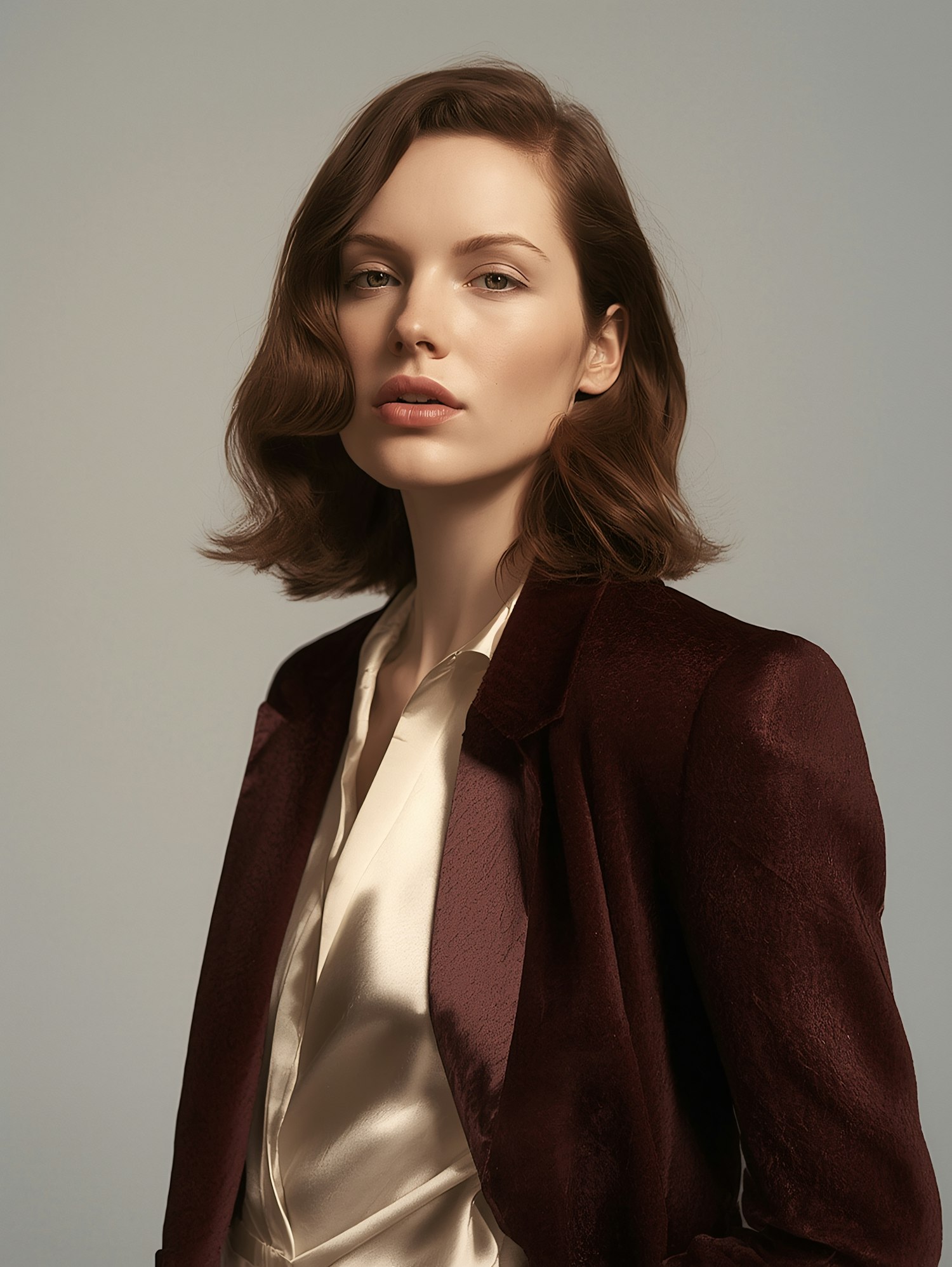 Elegant woman in a burgundy velvet blazer and cream satin blouse, posing against a neutral gray background with soft lighting.