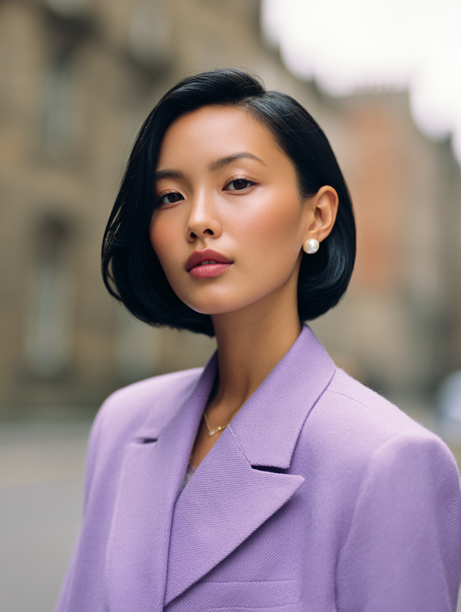 A woman with short black hair and a lavender blazer stands confidently in an urban setting, accessorized with pearl earrings.