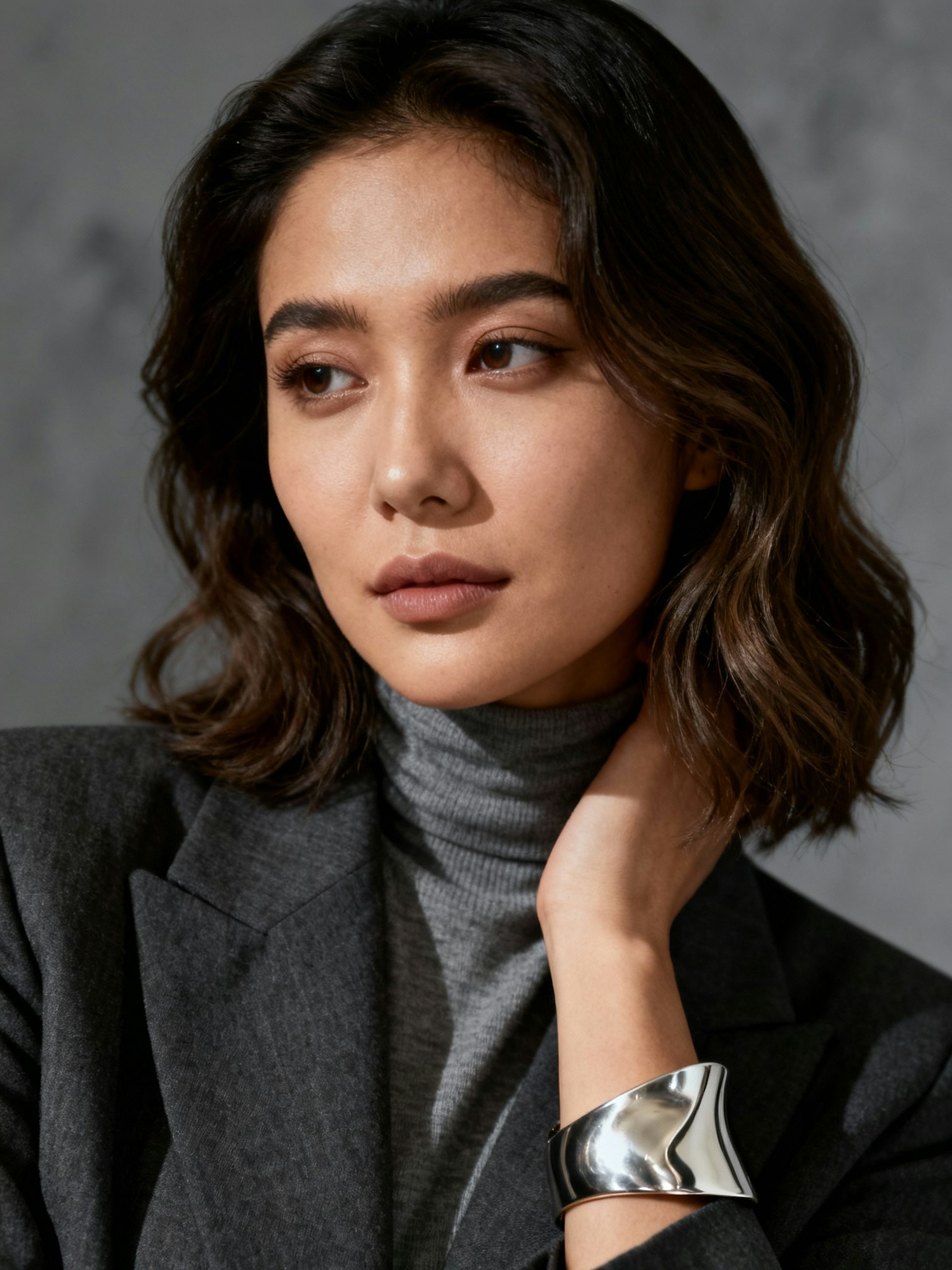 A stylish woman in a gray blazer and turtleneck, accessorized with a silver bracelet, gazes thoughtfully against a neutral background.