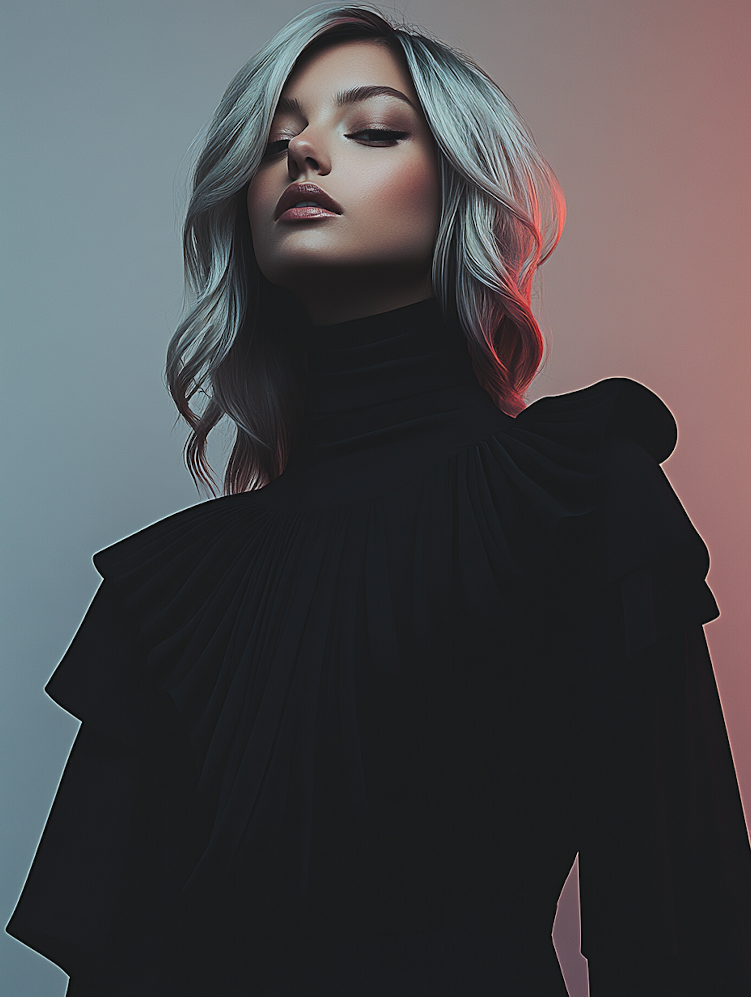 Elegant portrait of a woman with silver-blonde hair in a black pleated dress, set against a moody gradient background.