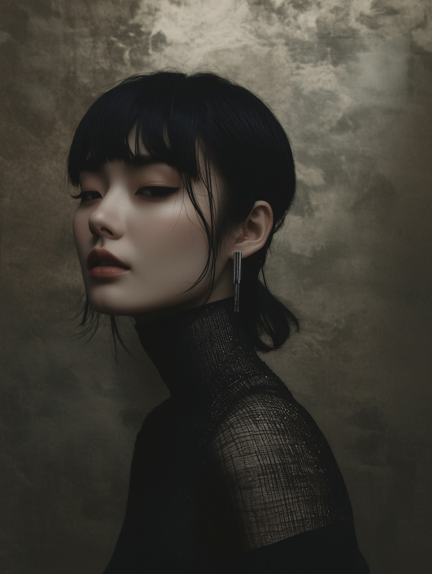 Elegant portrait of a woman in a textured black top, with sleek dark hair and striking makeup, set against a neutral textured background.