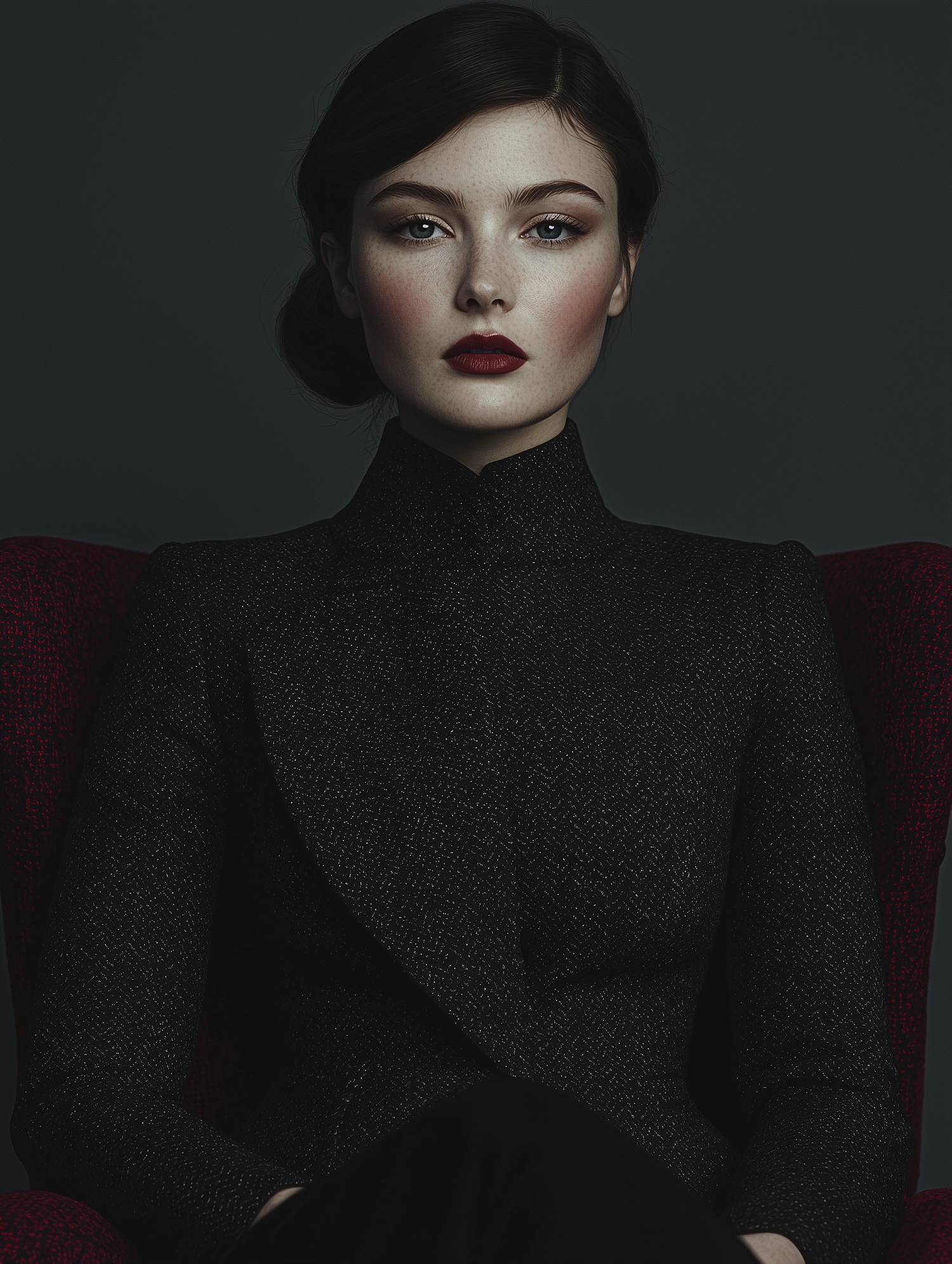 Elegant woman with dark hair and red lipstick in a textured black jacket, seated against a dark background.