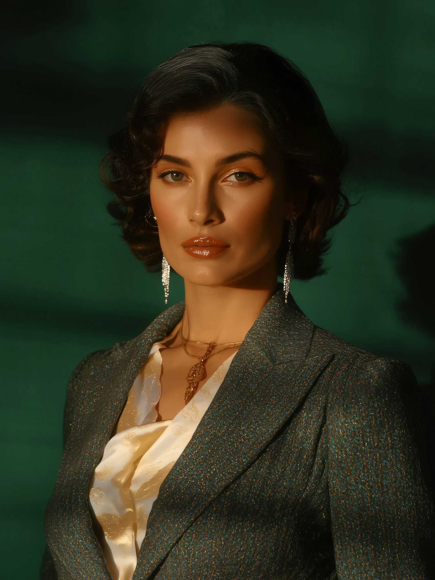 A woman in a green blazer and cream blouse, accessorized with sparkling earrings and a gold necklace, against a deep green background.