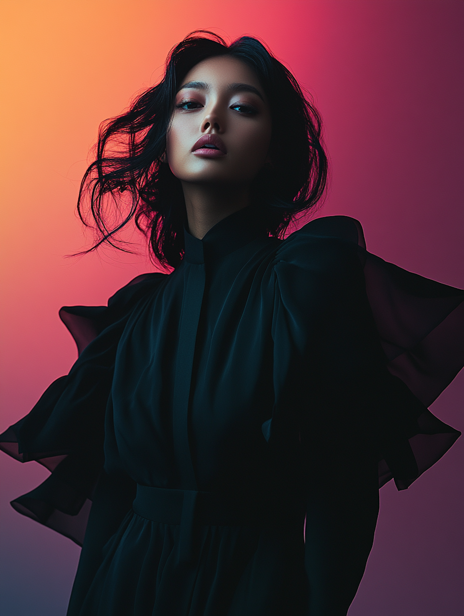 Elegant portrait of a woman in a black dress with sheer sleeves, set against a vibrant orange-pink gradient background.