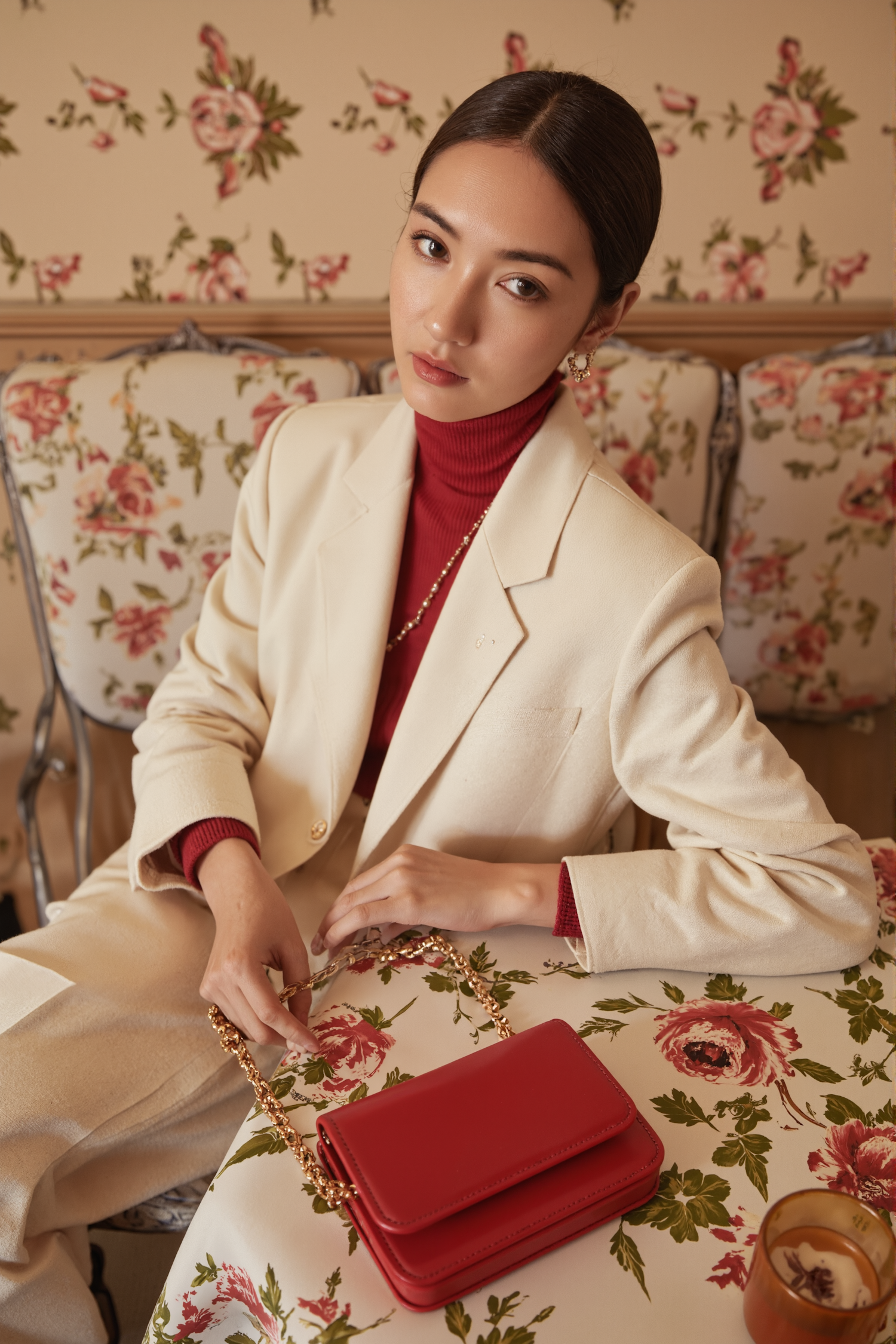 Elegant woman in cream blazer and red turtleneck with a red handbag on a floral tablecloth, set against a vintage floral backdrop.