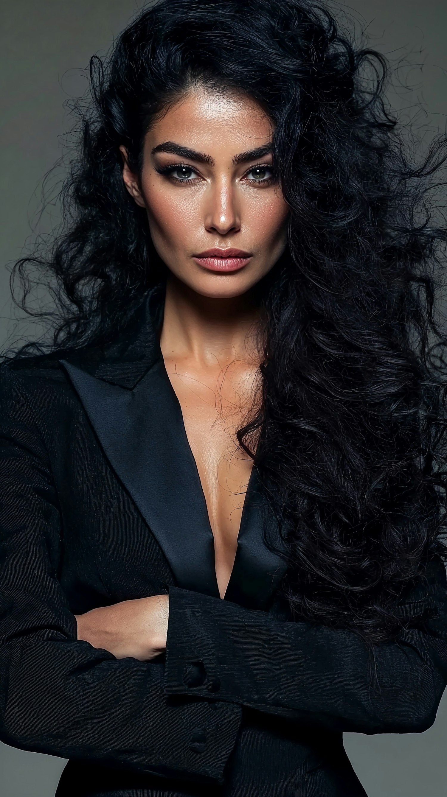 Confident woman with voluminous black curls and light brown eyes in a black blazer, posing with arms crossed against a neutral background.