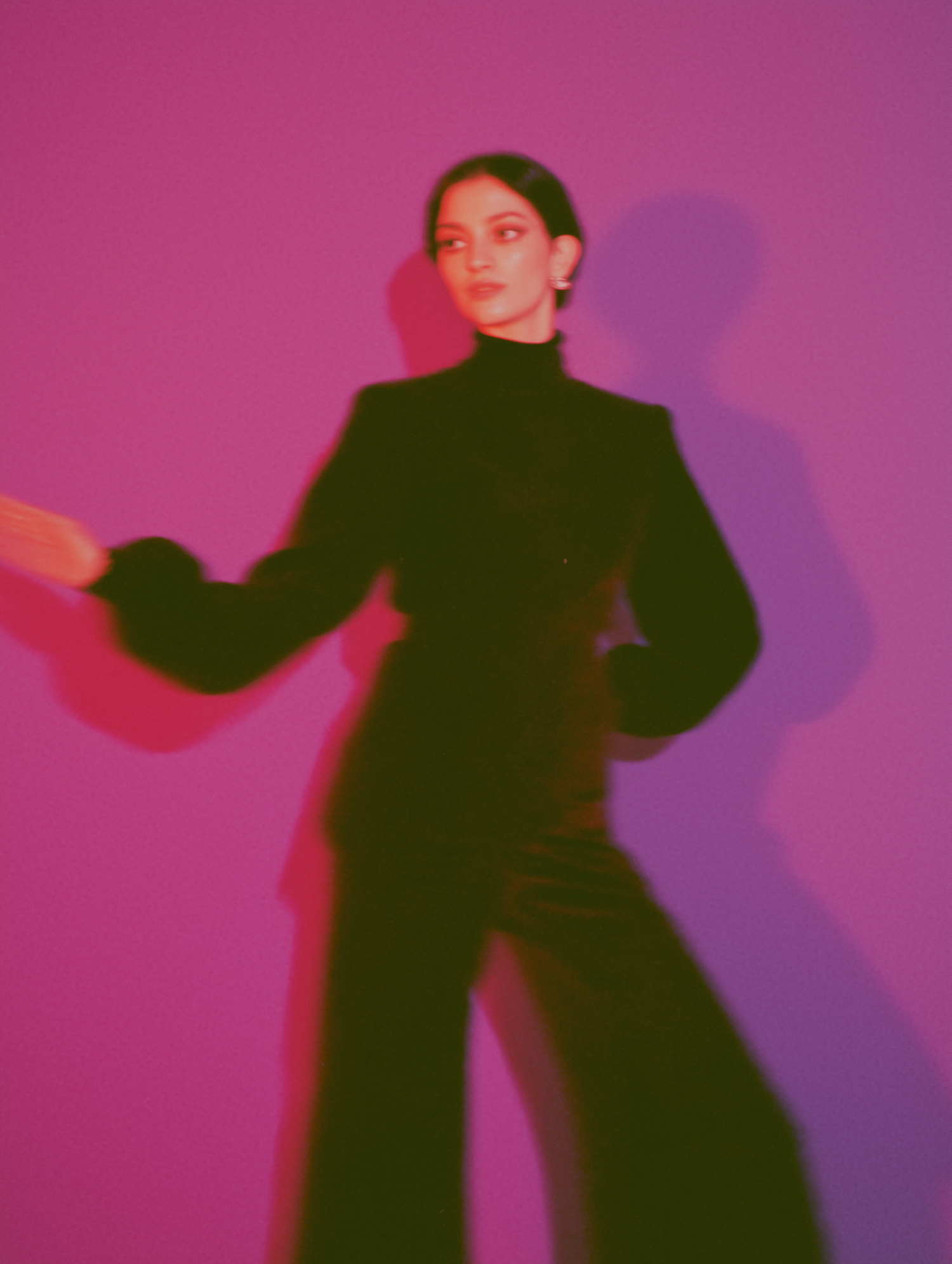 Artistic photo of a woman in a modern outfit against a vibrant pink background, with moody lighting and an abstract composition.