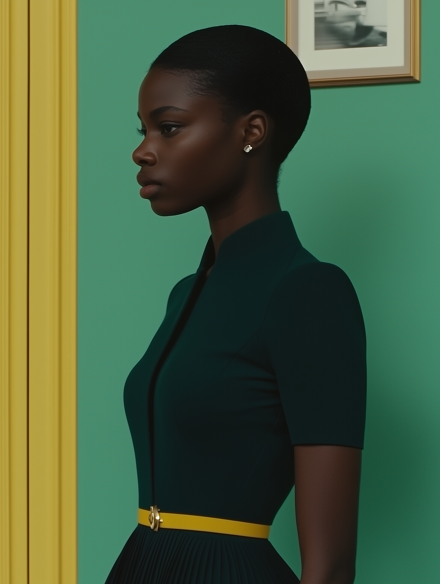 Elegant profile of a woman in a dark green dress with a yellow belt, set against a vibrant green and yellow background.