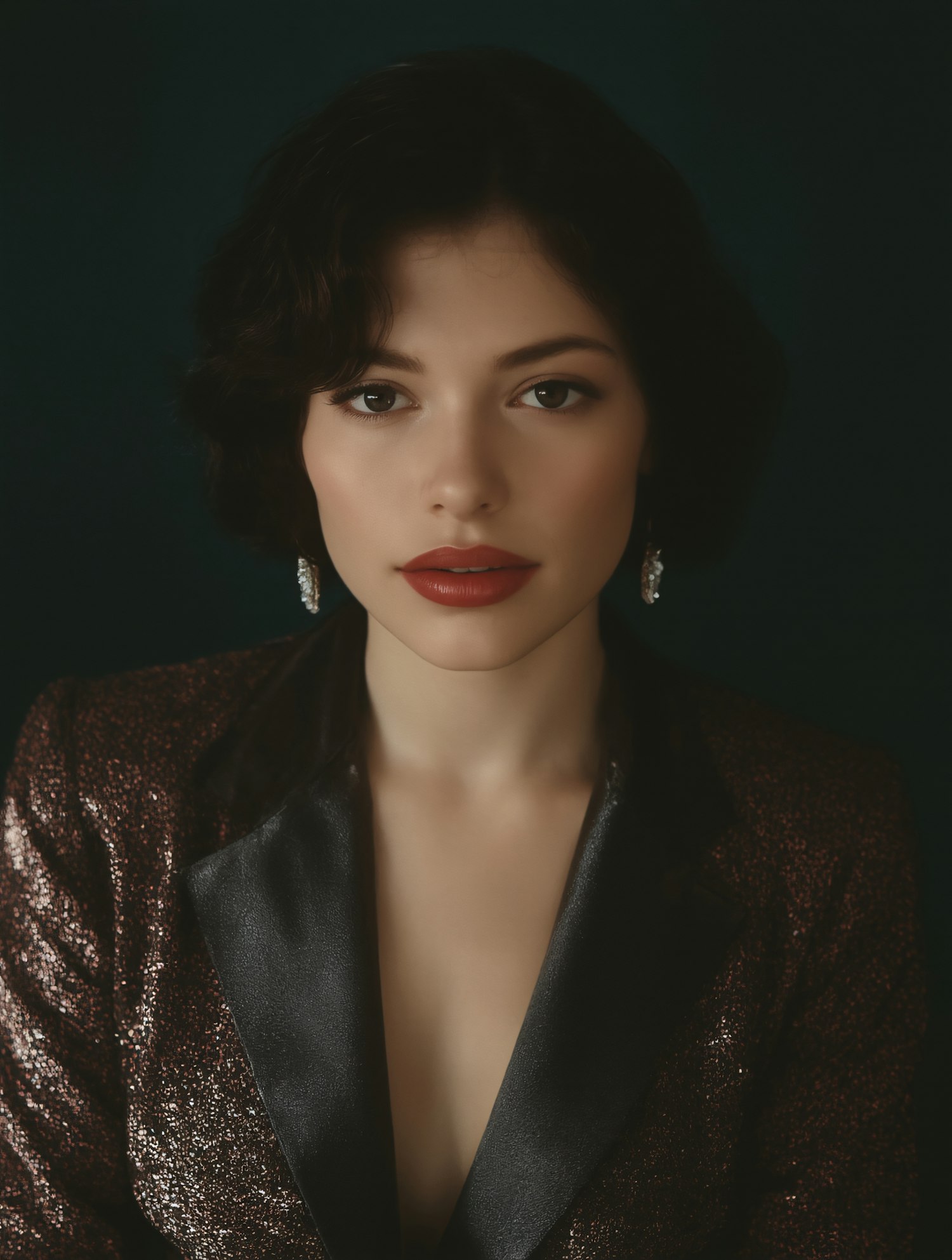 Elegant portrait of a woman with short dark hair, red lipstick, and a shimmering jacket, set against a deep background.
