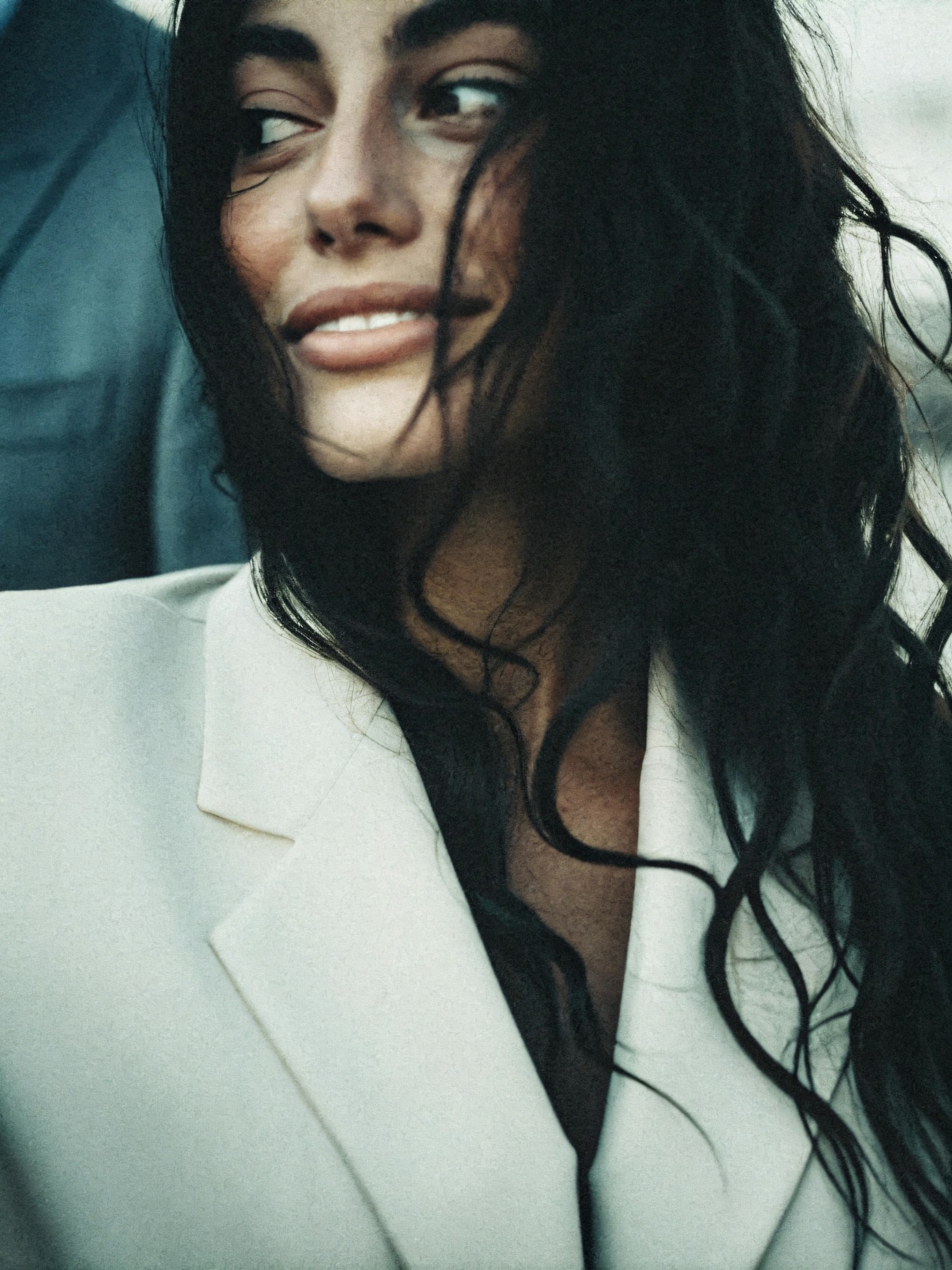 Close-up of a woman with wavy black hair and a light blazer, looking to the side with a subtle smile. Soft lighting creates an intimate feel.