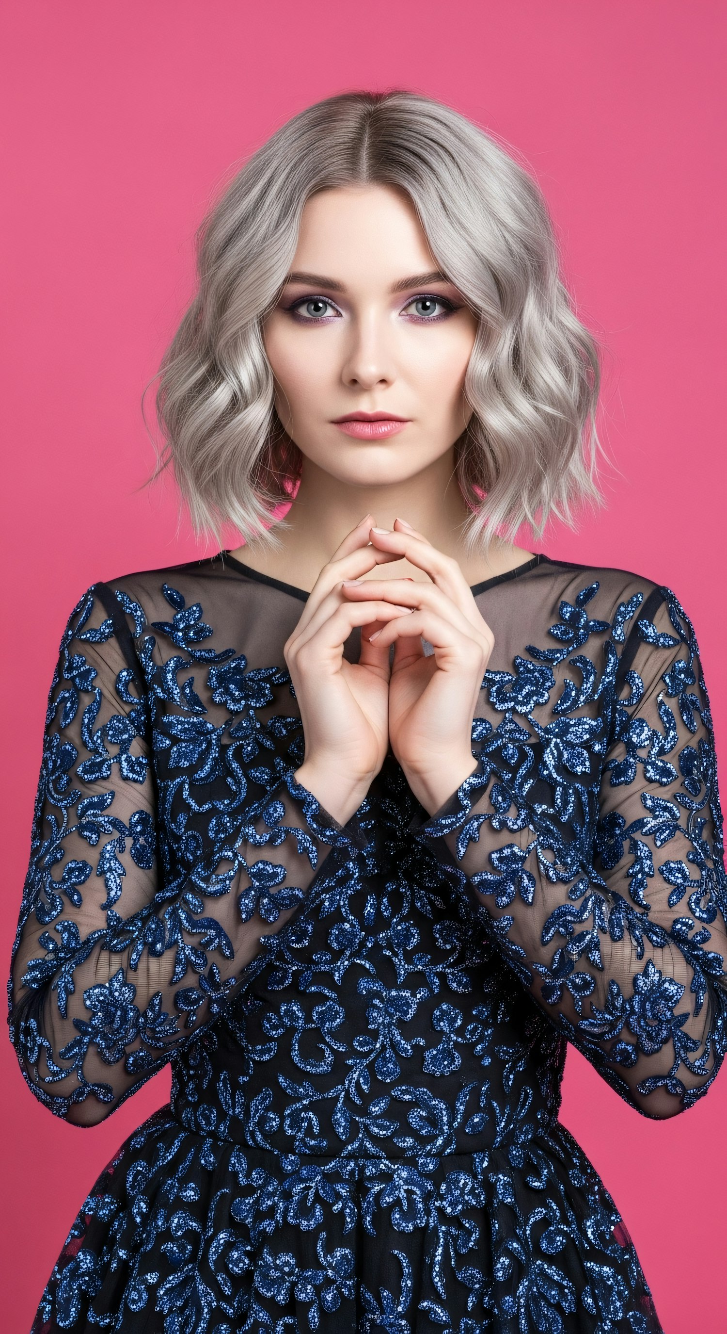 Young woman with gray hair and stylish floral attire against a pink background, exuding poise and charm. Perfect portrait detail.