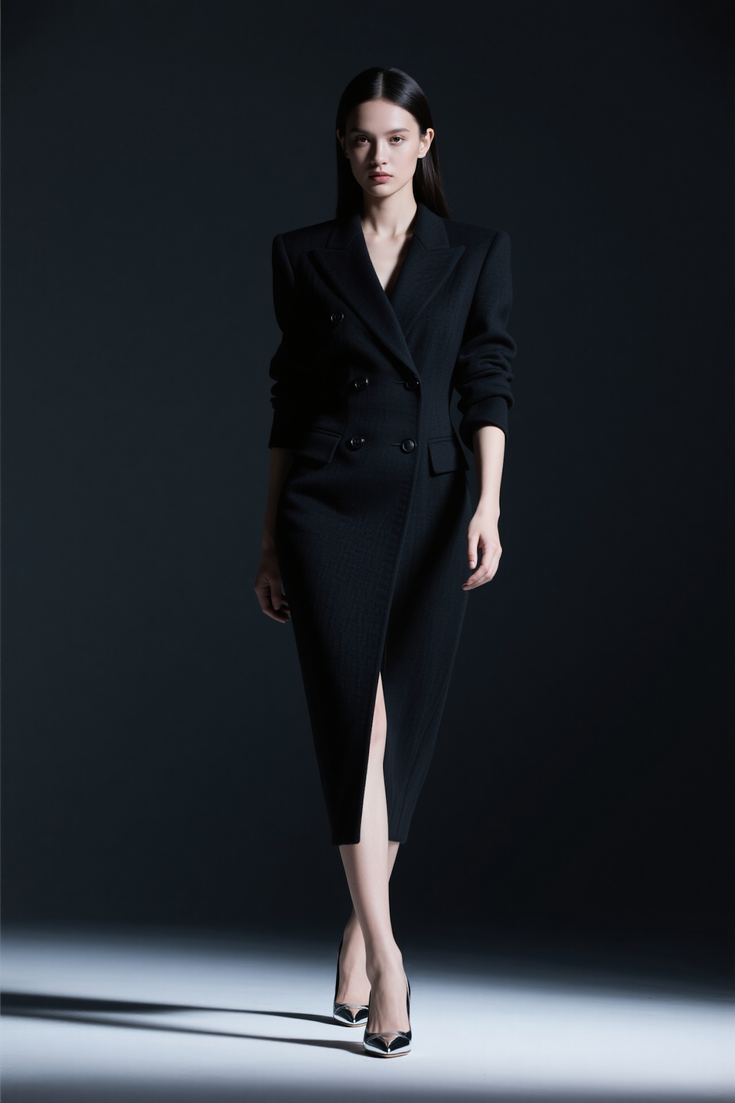 Elegant woman in a black blazer dress with a thigh-high slit, paired with metallic-accented heels, standing against a dark background.