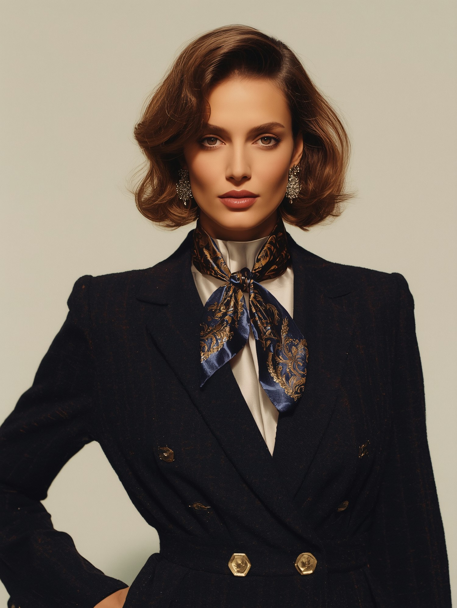 Elegant woman in a navy blazer with gold buttons, silk scarf, and statement earrings, exuding timeless sophistication.
