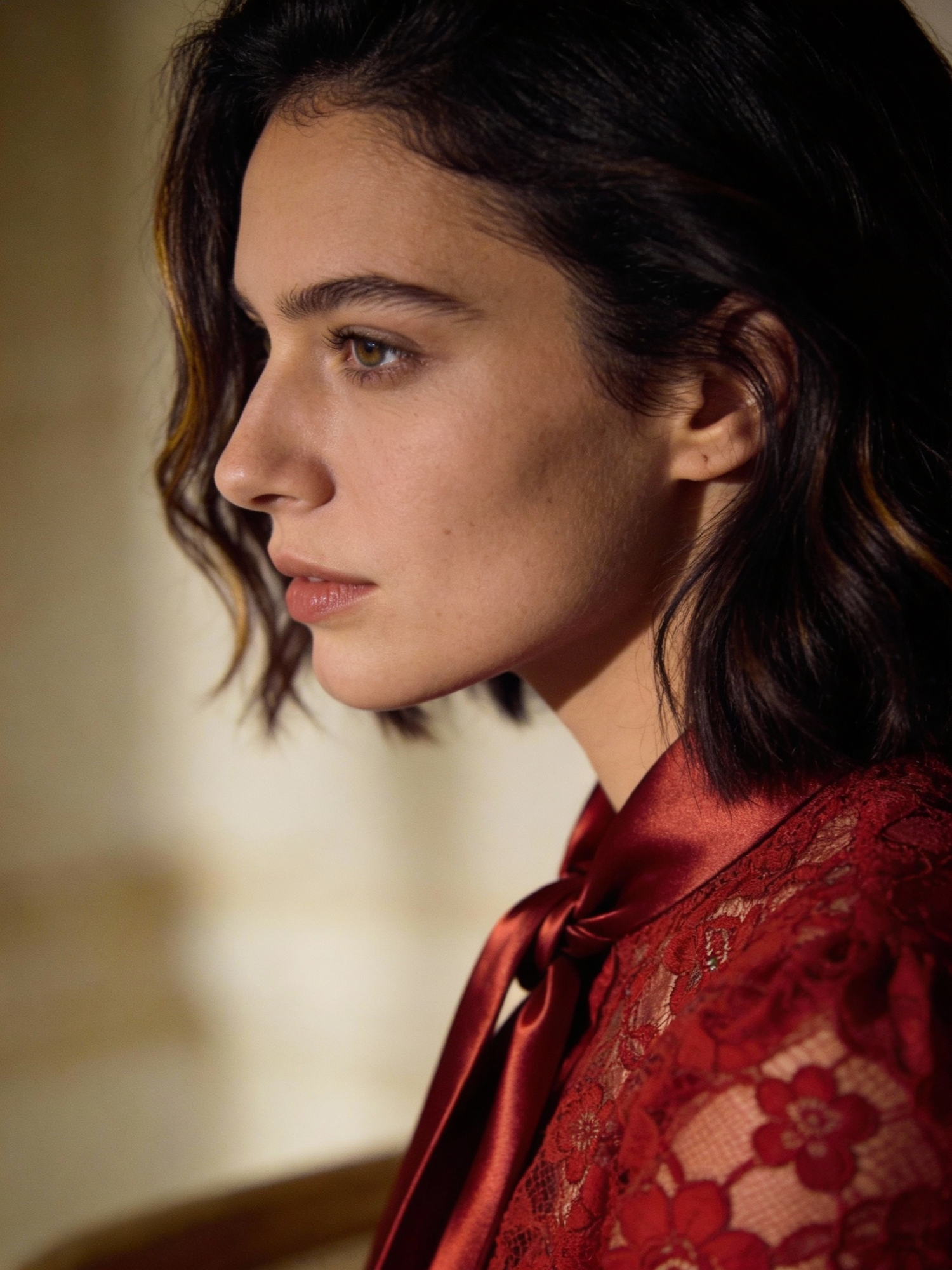 Close-up profile of a woman in a red lace blouse with a satin bow, her dark hair styled in waves, captured in warm, soft lighting.