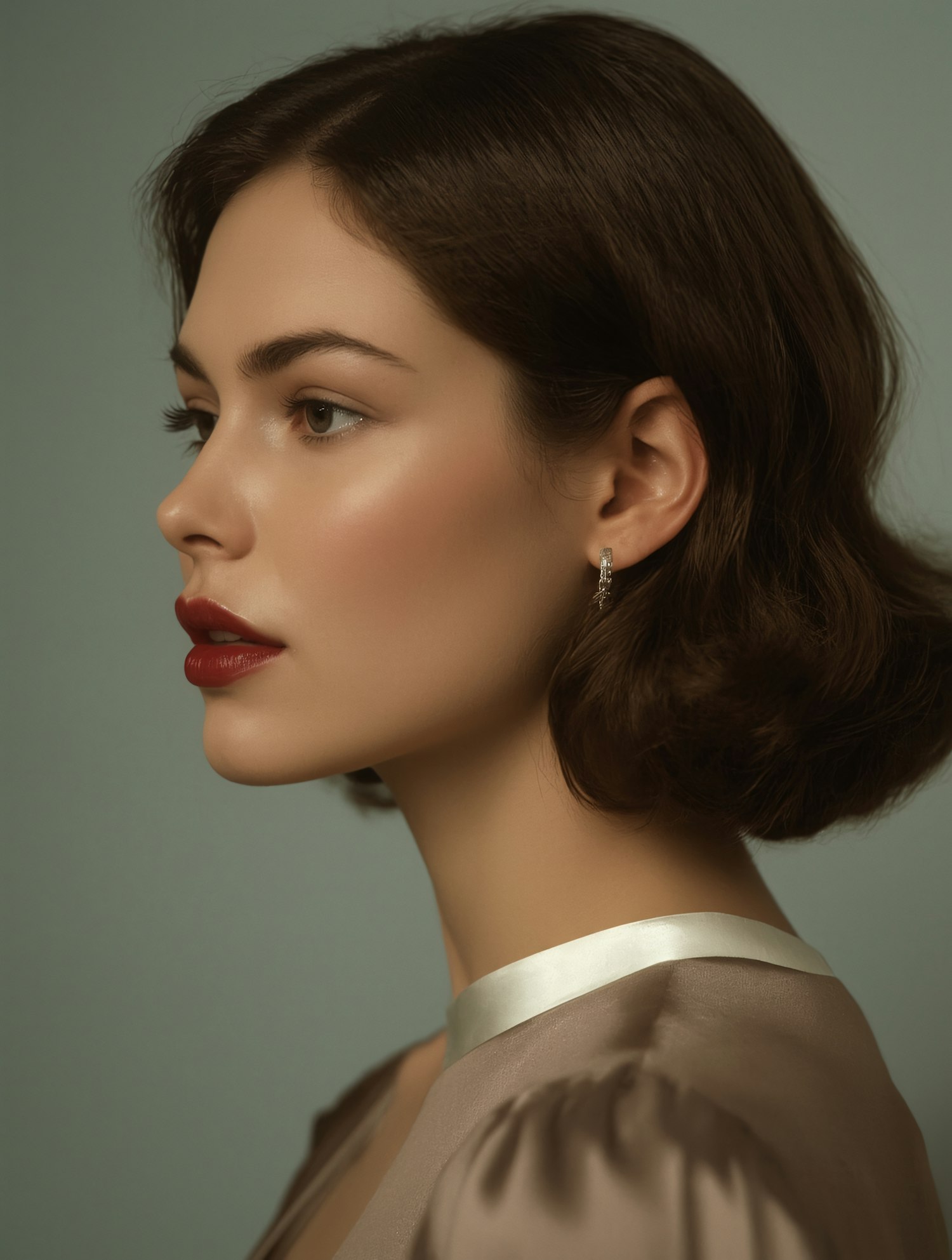Elegant profile portrait of a woman with short brown hair, red lipstick, and a beige satin top against a muted green background.