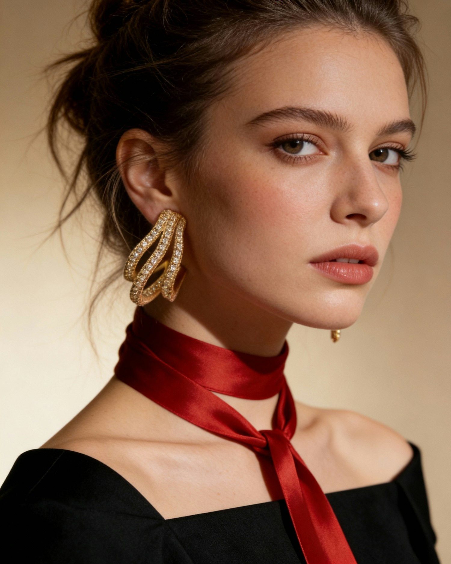 Elegant woman with gold earrings and a red scarf, showcasing a sophisticated style against a warm background.