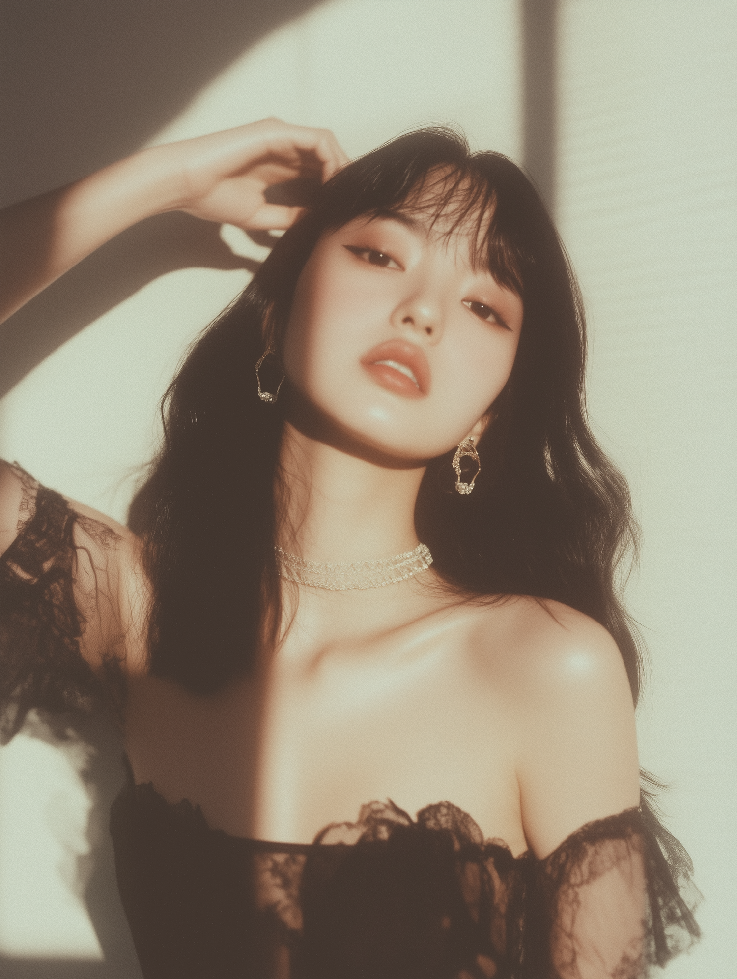 A stunning portrait of a woman in soft lighting, showcasing her elegant style with black lace and delicate jewelry.