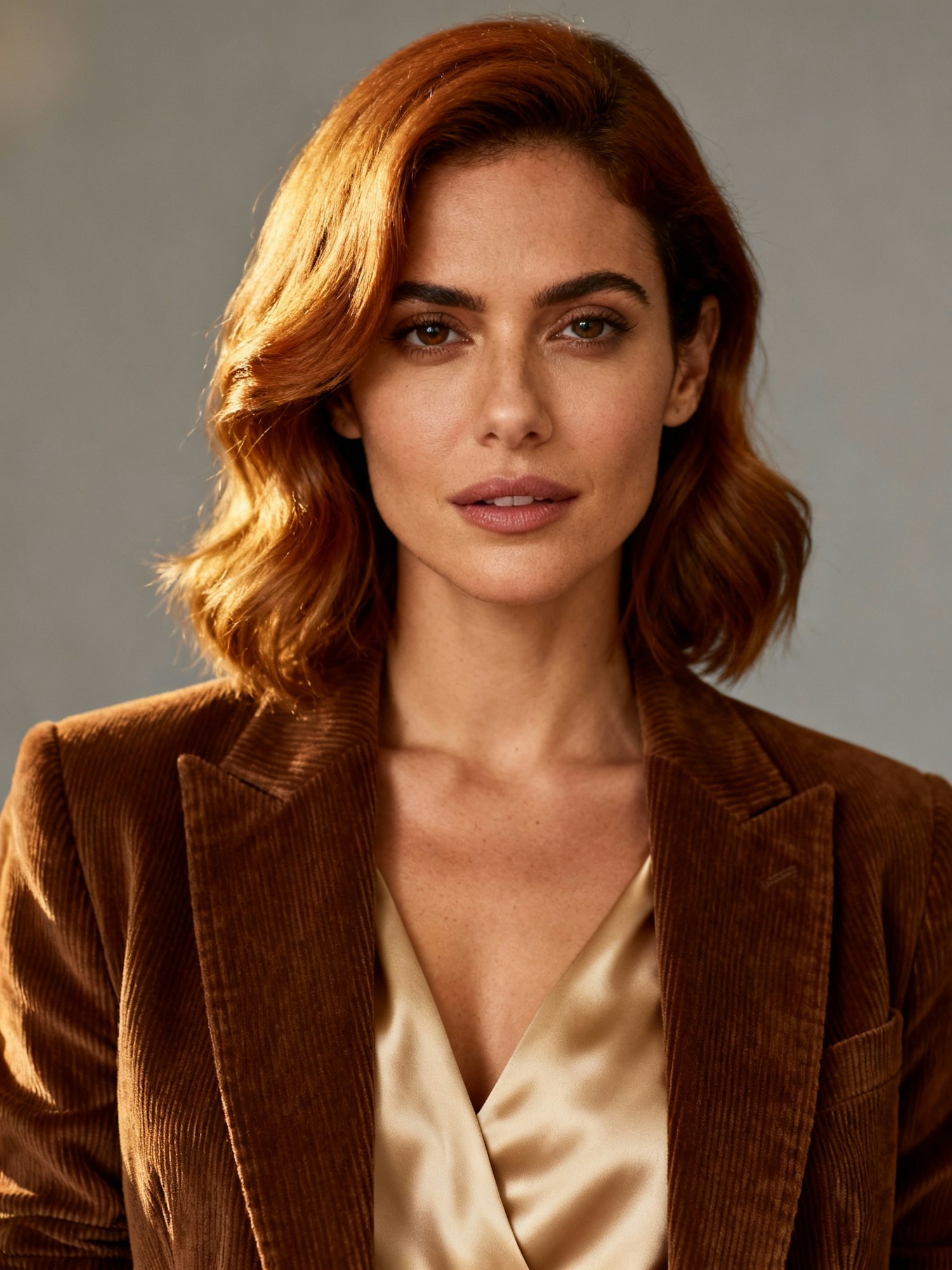 A woman with auburn hair in a brown blazer and satin blouse, looking confidently at the camera against a neutral background.