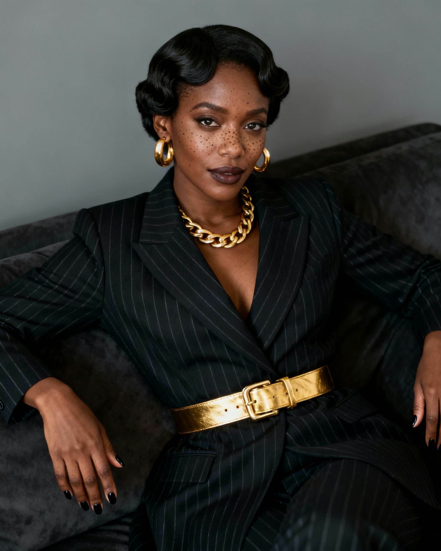 Seated, high-definition portrait of a Black woman wearing a dark pinstripe suit with a belted waist. Her hair is styled in short finger waves. She wears large gold earrings, a gold chain necklace, and a gold belt. Her nails are painted black, and she has visible freckles. She sits on a dark couch with a confident, composed expression. The neutral gray background enhances the dark tones of her outfit and the gold accents, making the layered textures stand out. Lighting is soft and directional, casting gentle highlights across her face and garment. The mood is tailored, vintage-modern, and editorial—ideal for an Afro-fusion fashion portrait or power identity showcase.