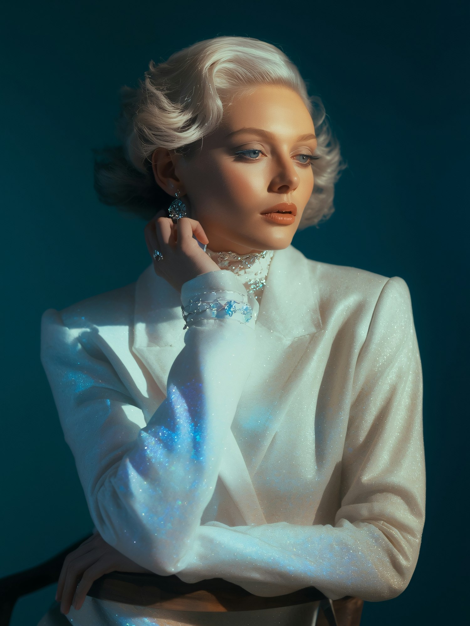 Elegant woman in a shimmering white outfit with blonde hair and sparkling jewelry, set against a deep teal background.