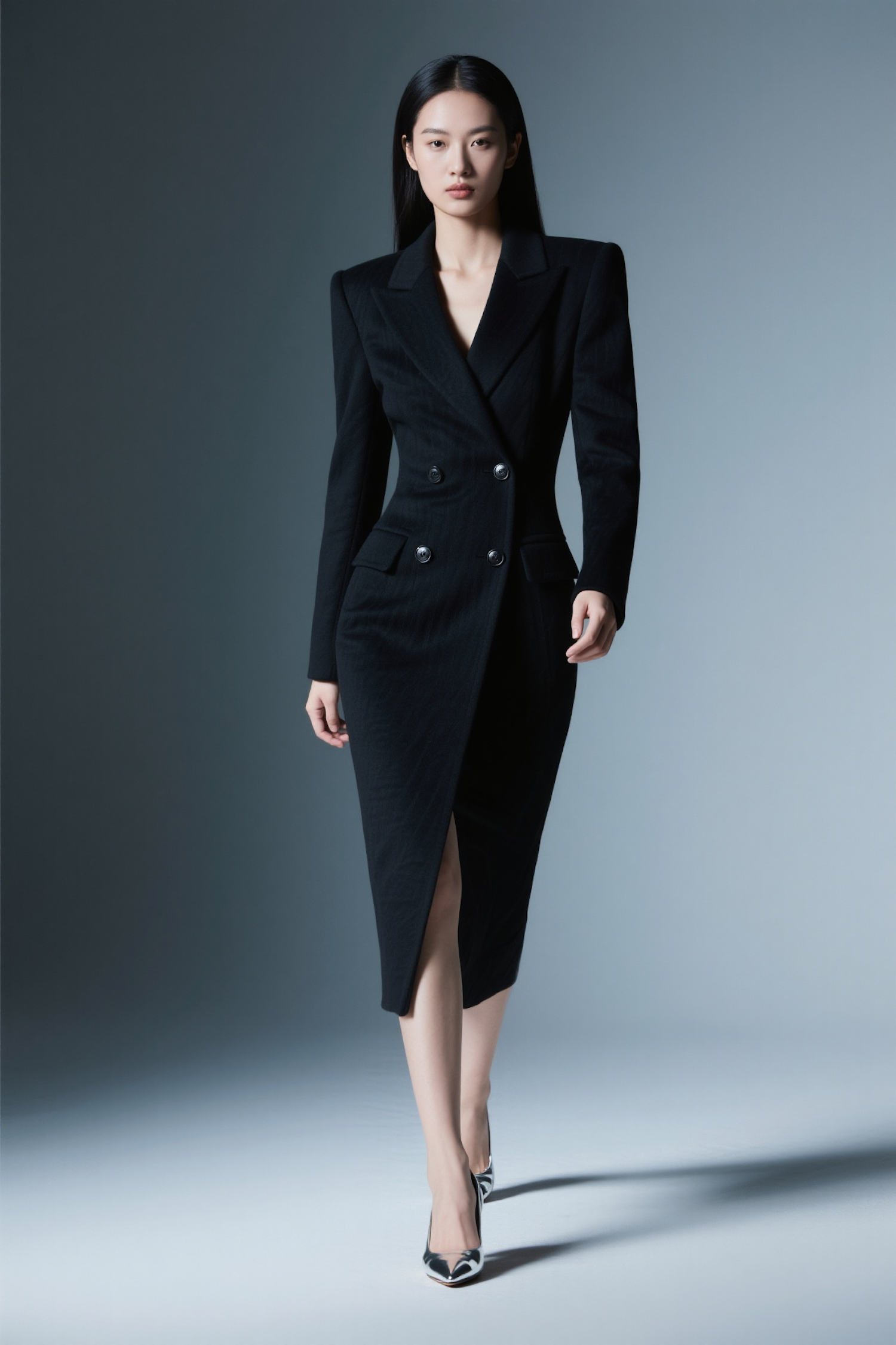Elegant woman in a black blazer dress with sharp shoulders and a front slit, paired with black and silver heels, against a gray background.