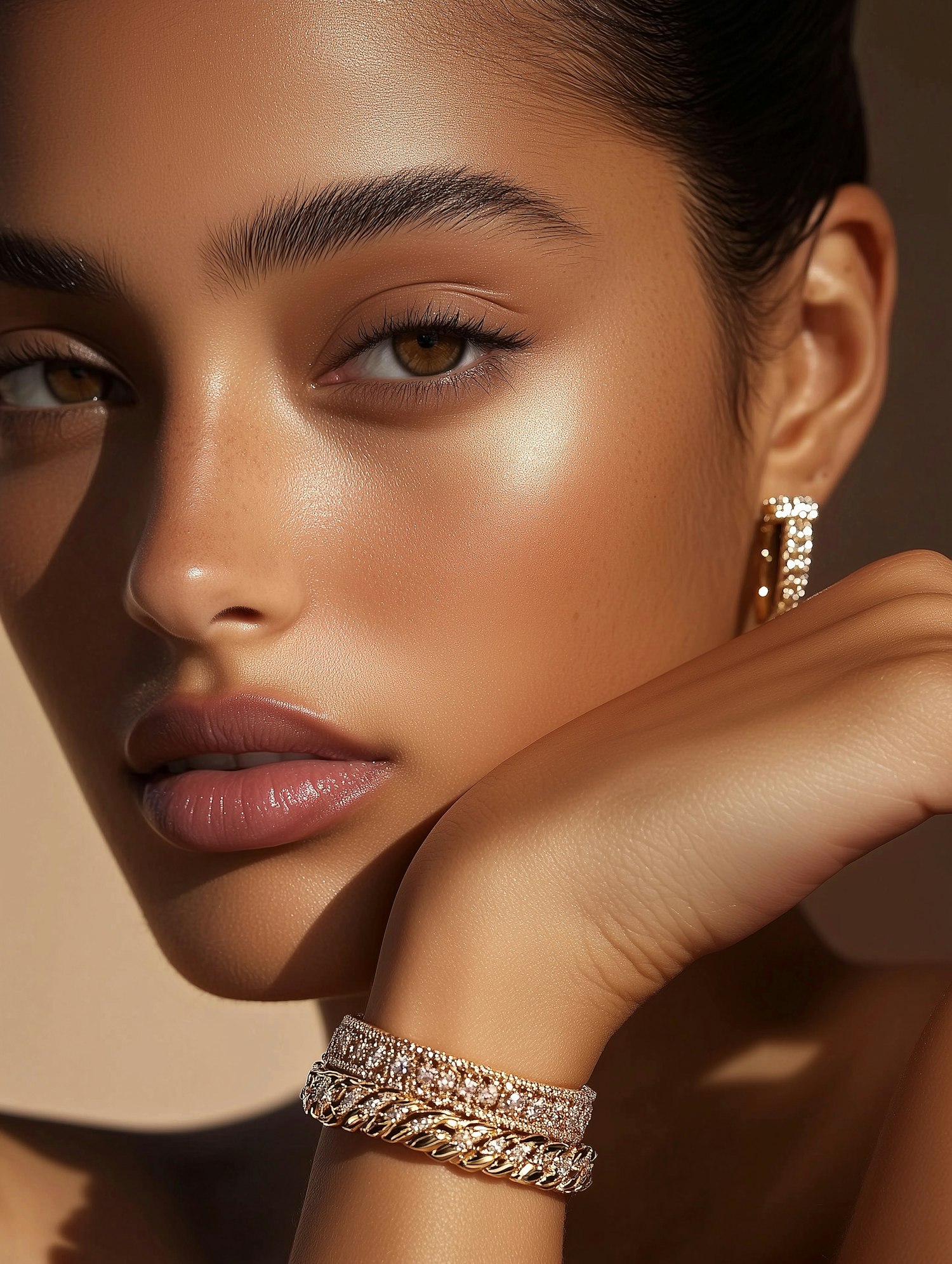 Close-up of a woman with glowing skin, brown eyes, glossy lips, and gold jewelry, including hoop earrings and stacked bracelets.