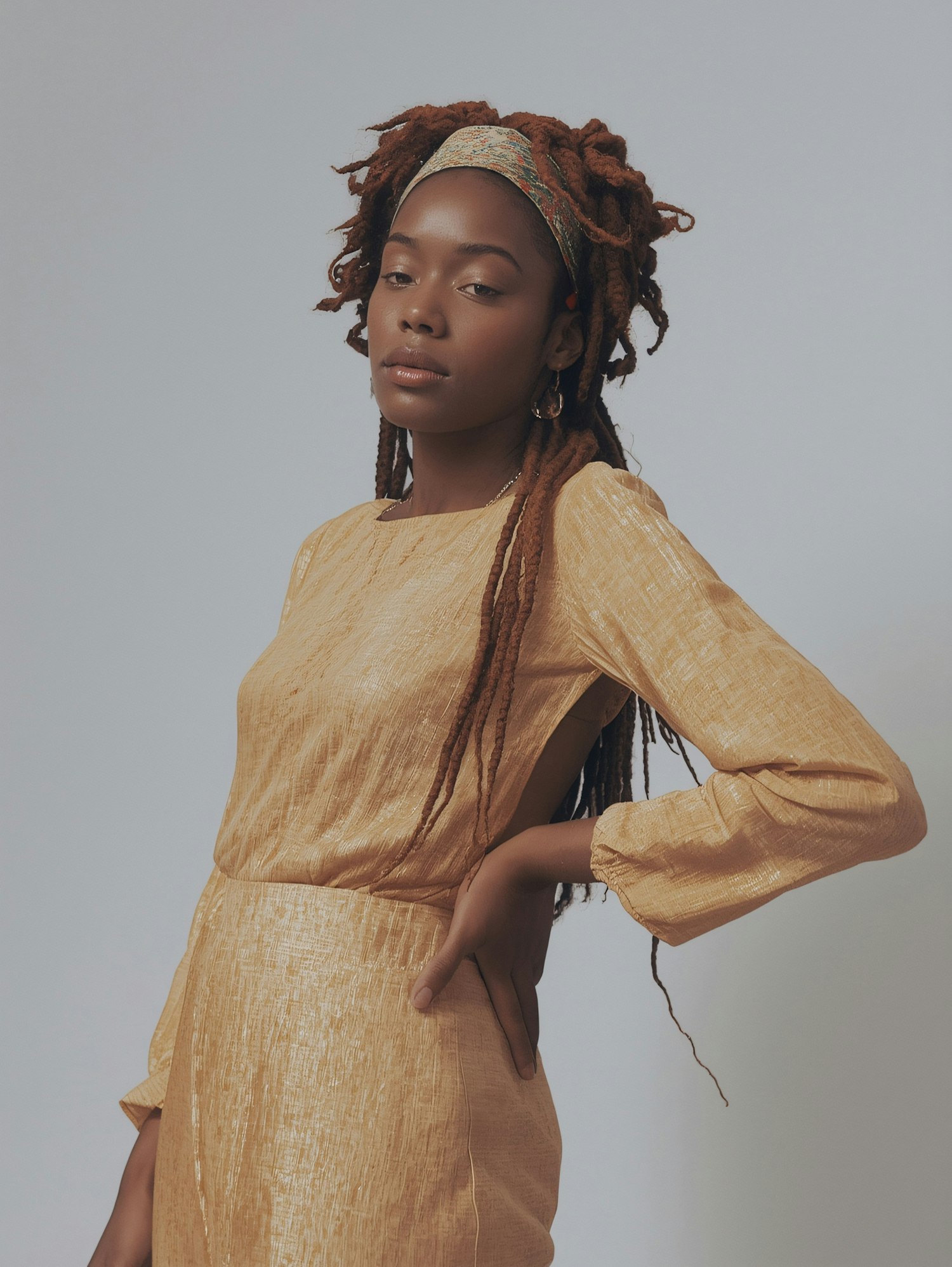 Stylish woman in a golden dress with dreadlocks and a headband, posing confidently against a neutral background.