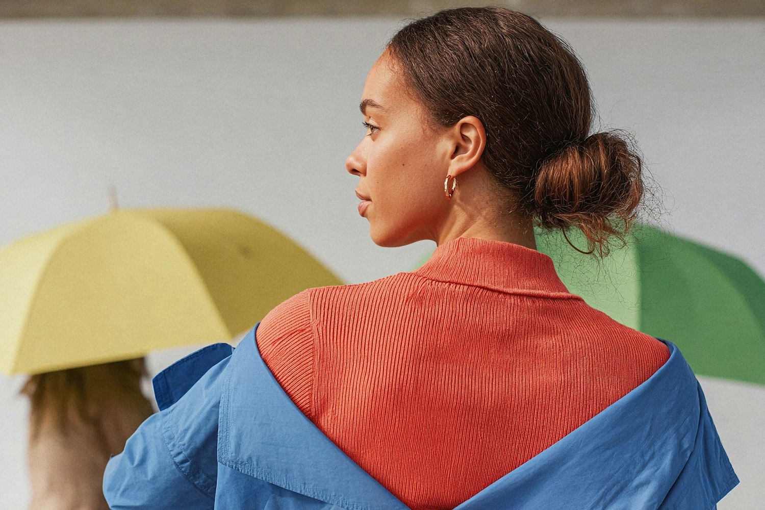 A stylish woman in an orange top and blue jacket stands against a backdrop of colorful umbrellas, creating a vibrant and modern scene.