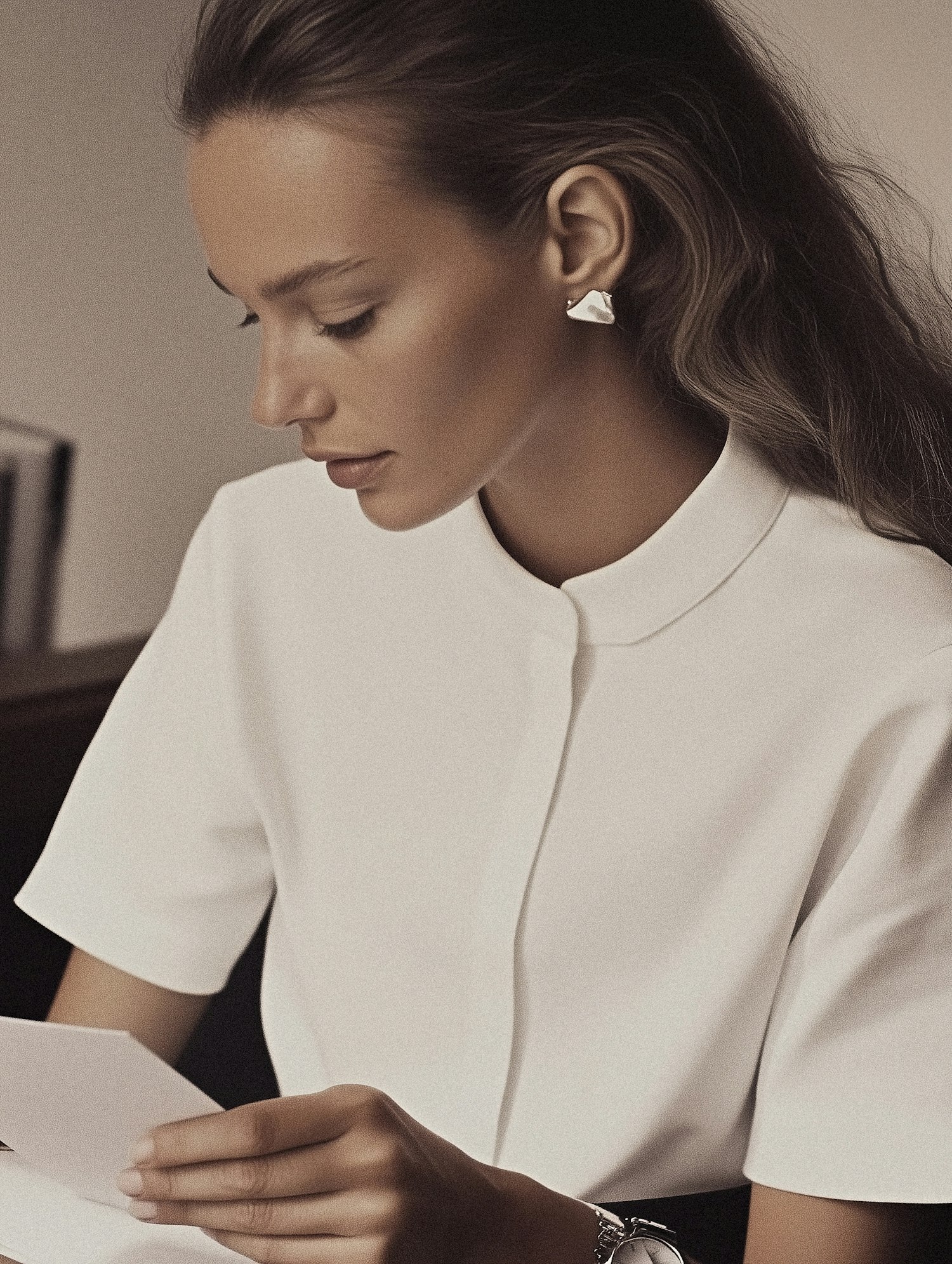 A woman in a white blouse and silver jewelry reads a paper, exuding calm focus in a softly lit, minimalistic setting.