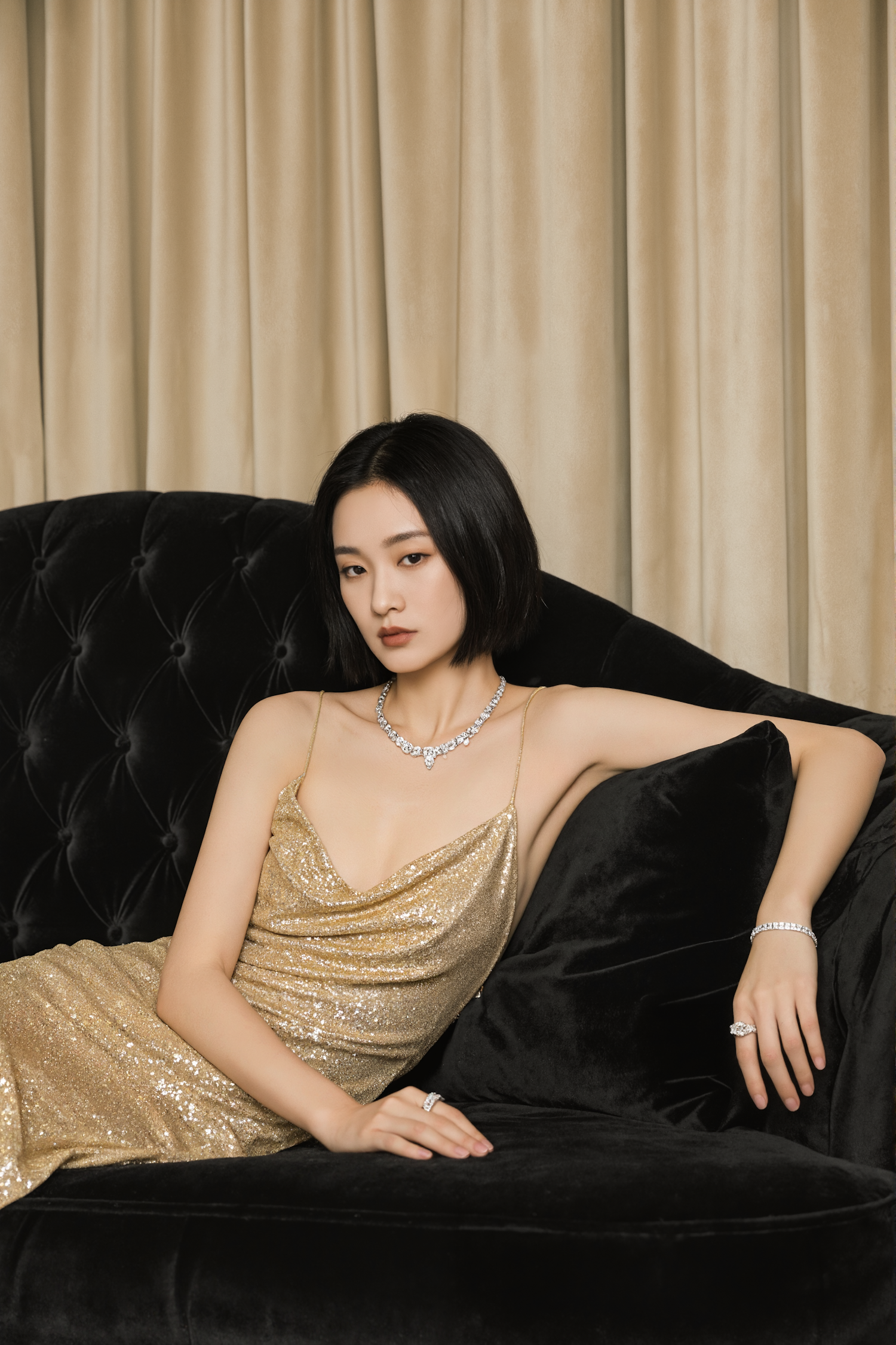Elegant woman in a gold gown with diamond jewelry reclines on a black velvet sofa, exuding sophistication against beige curtains.