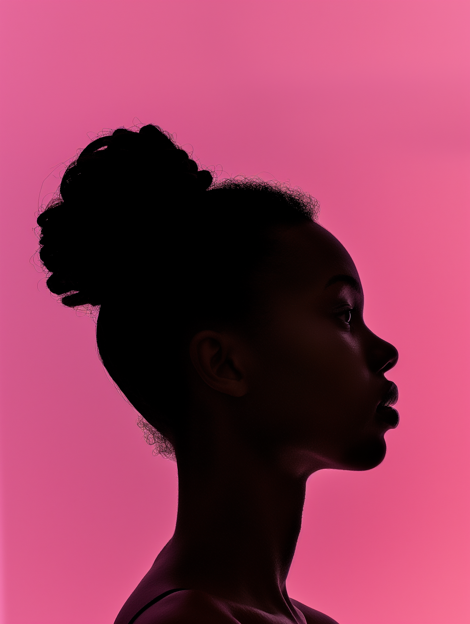 Silhouette of a woman with a high bun against a vibrant pink background, highlighting her profile and elegant neck curve.