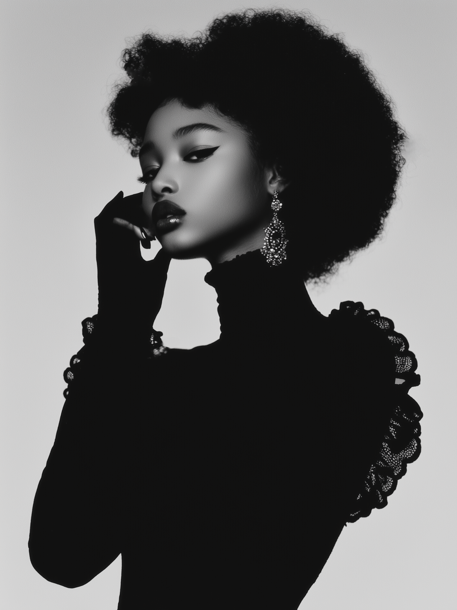 Elegant black and white portrait of a young woman with afro hair, bold makeup, and ornate earrings, exuding confidence and style.
