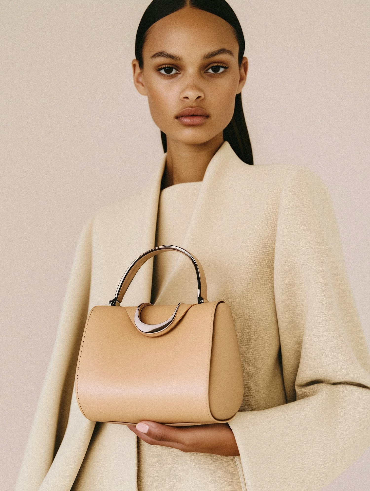 Elegant woman with sleek black hair holds a chic beige handbag, wearing a cream coat. Minimalist and sophisticated fashion style.