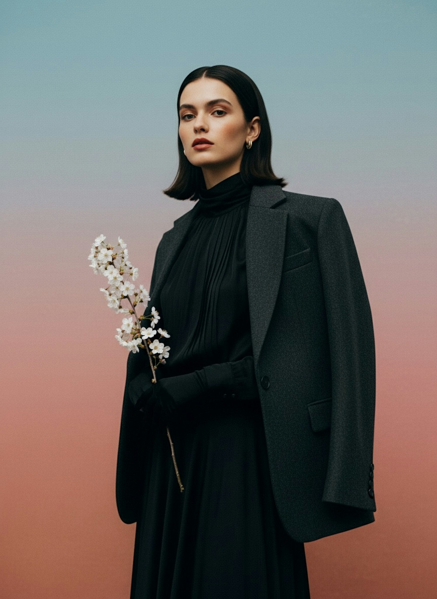 A poised woman in a dark outfit holding white blossoms, set against a gradient background transitioning from blue to pink.