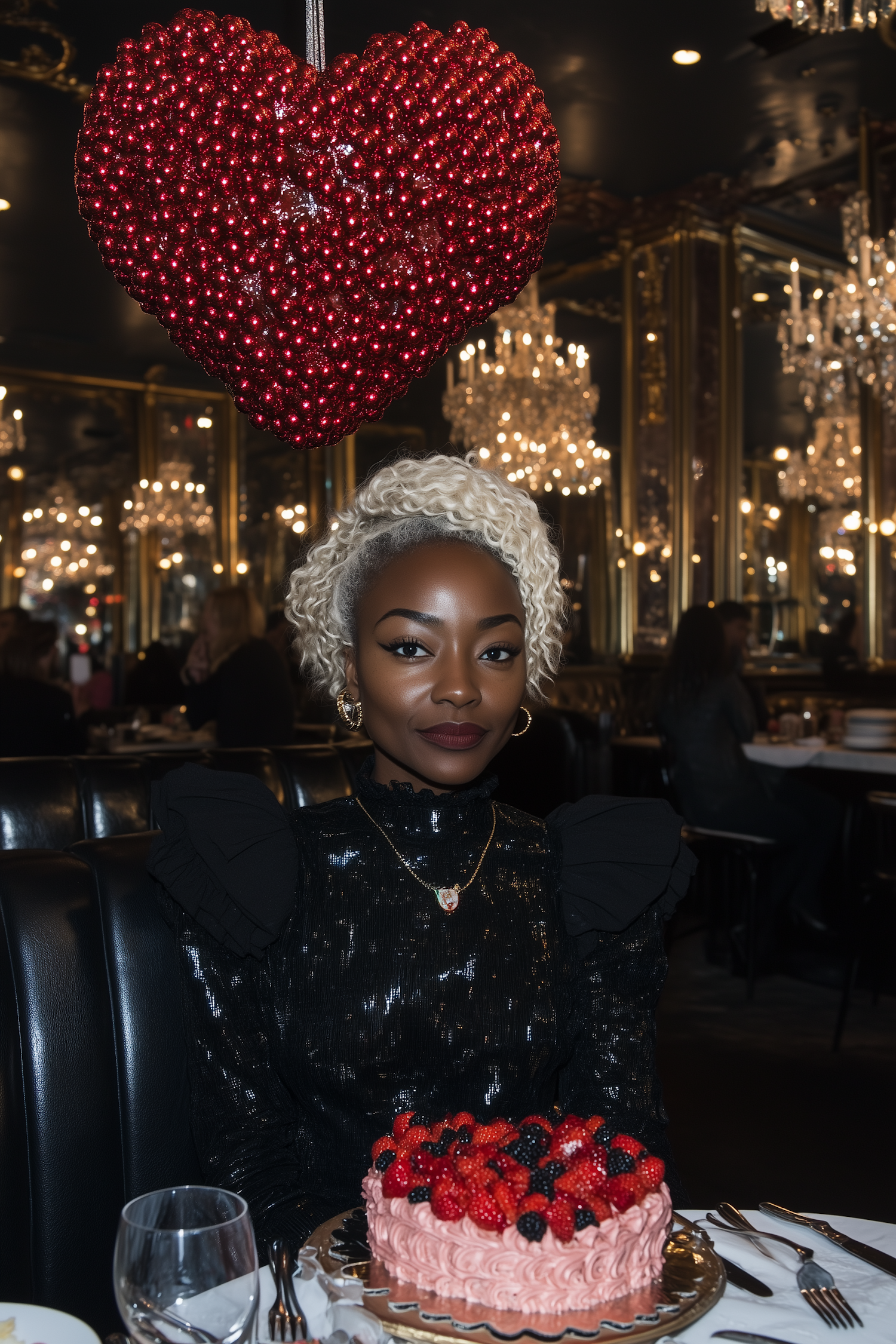 Elegant woman in a black dress with a berry-topped cake, seated under a red heart in a luxurious, chandelier-lit restaurant.