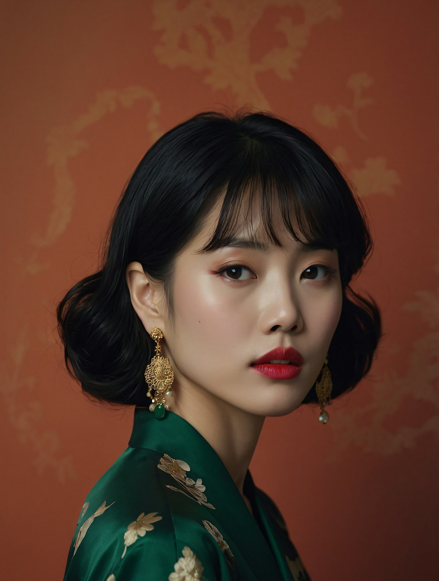Elegant Asian woman in green silk with gold earrings, red lipstick, and a warm orange floral background.