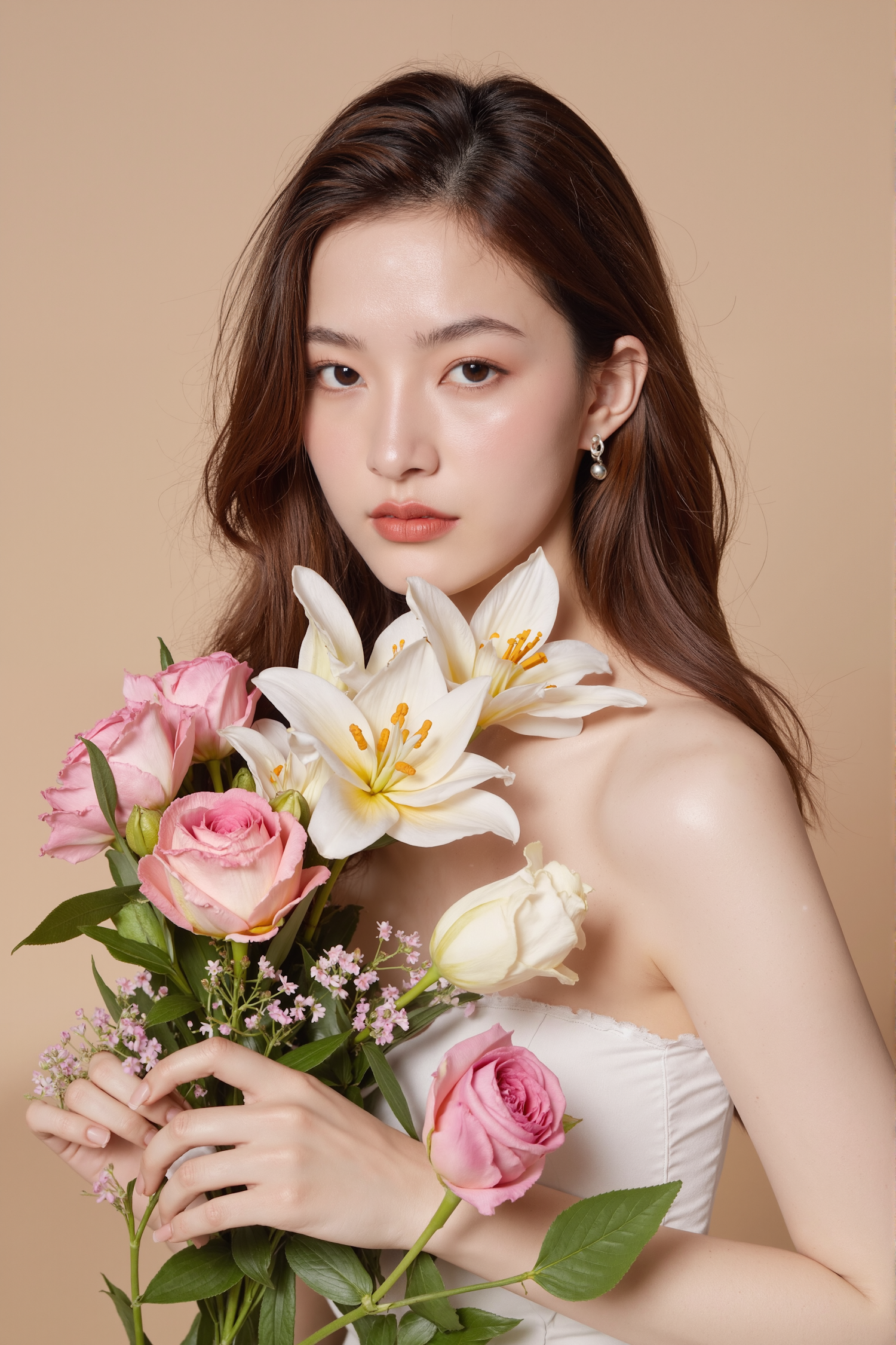Elegant woman with wavy brown hair holding a bouquet of lilies and roses, set against a warm beige background. Soft and serene vibe.