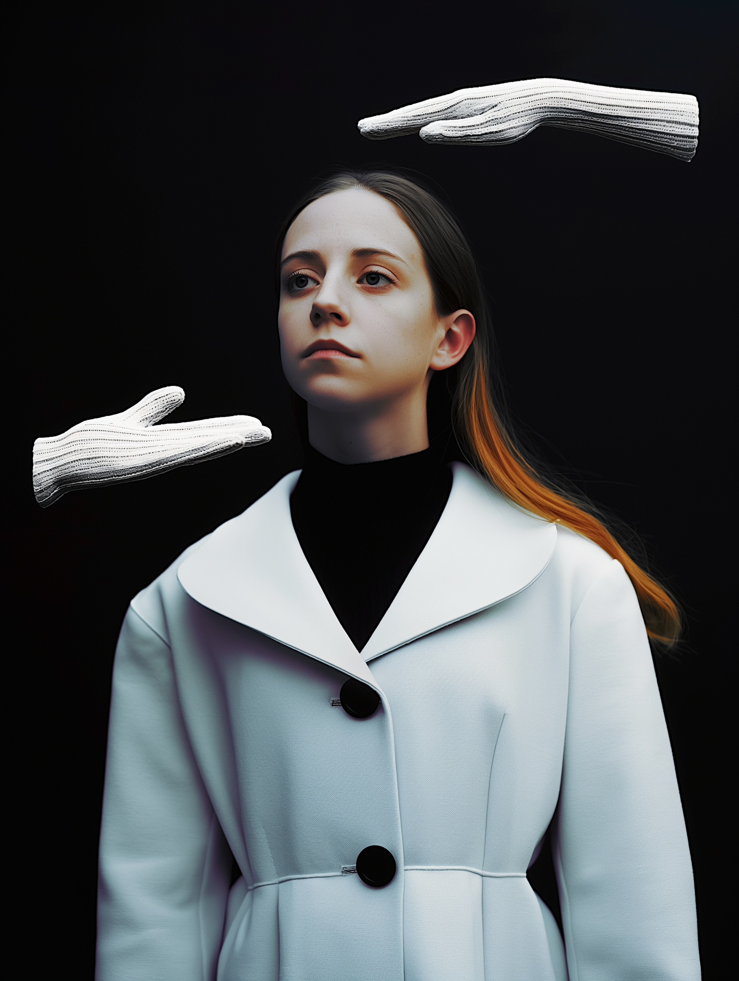 A young woman in a white coat with floating white gloves against a dark background, creating a surreal and mysterious atmosphere.