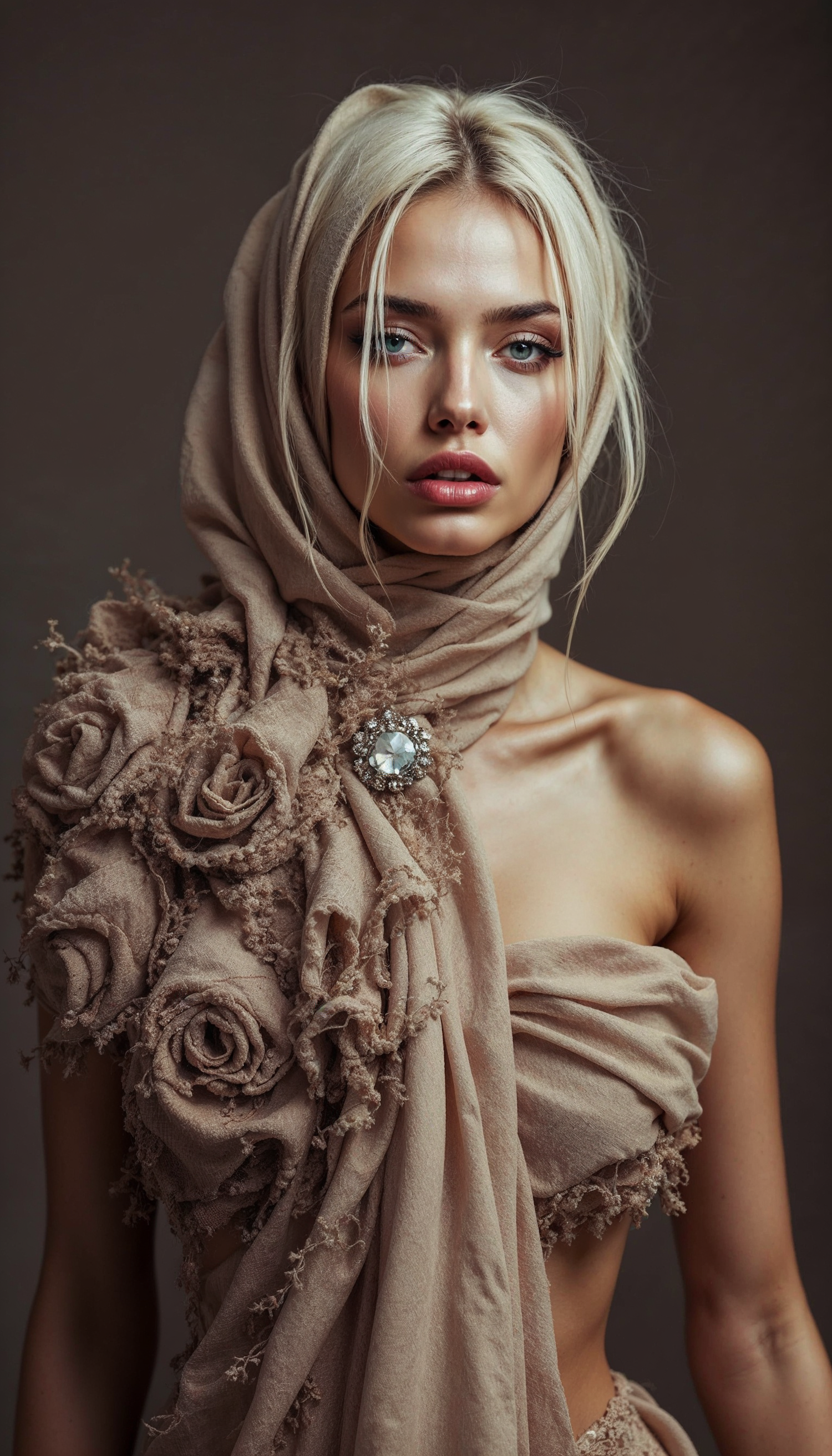 Elegant woman in beige headscarf with fabric roses and brooch, blonde hair, blue eyes, calm expression, muted brown background.